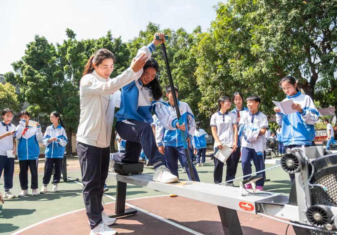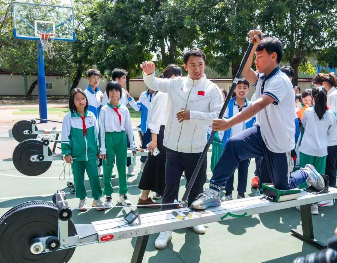 热烈交流之余,冠军们更是化身“体育老师”,在校园里指导学生们体验皮划艇基础动作,手把手传授发力、平衡技巧,纠正学生们的划桨姿势,让孩子们在“劈波斩浪”的模拟体验中,感受水上运动的独特魅力。