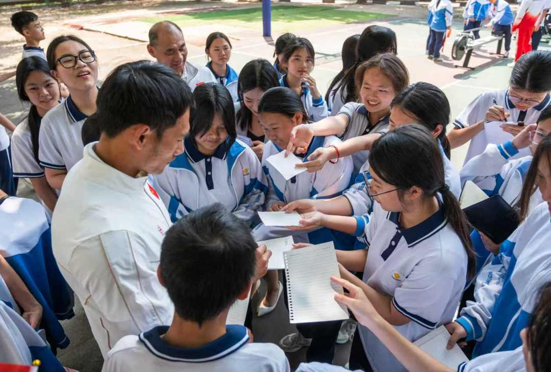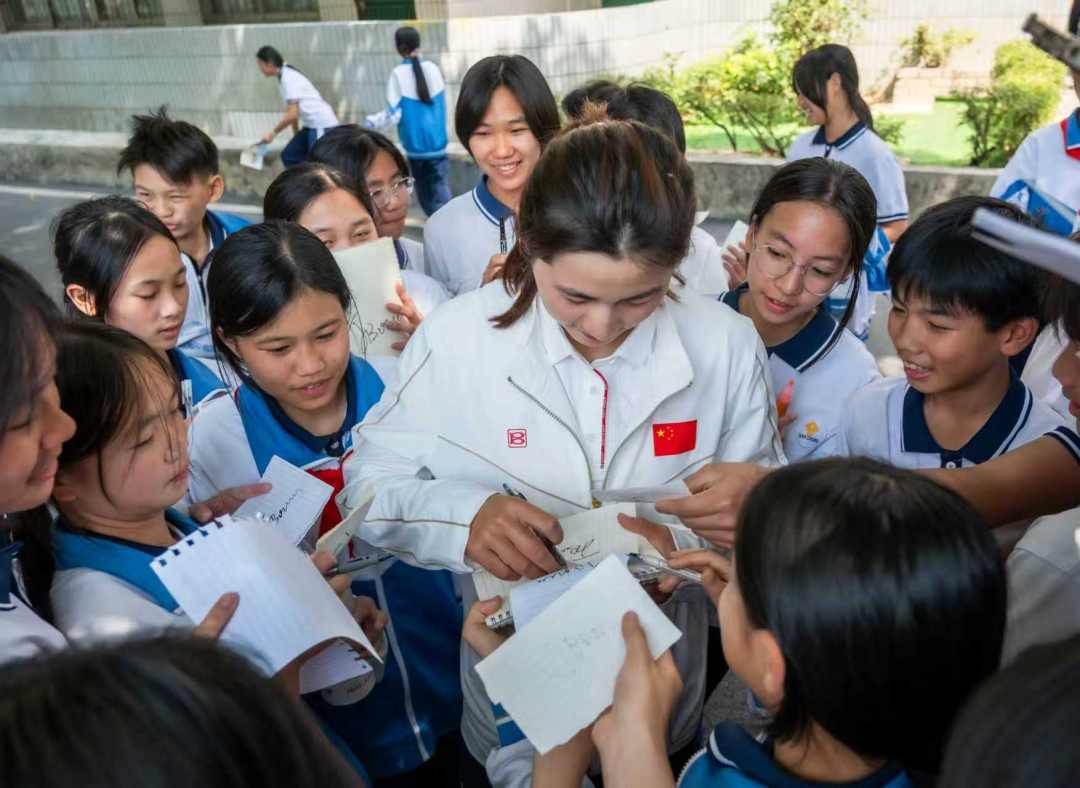 当日,冠军们的到来瞬间点燃了学生们的热情,竹料三中操场上一片沸腾。同学们十分兴奋,纷纷围着冠军们合影、签名。