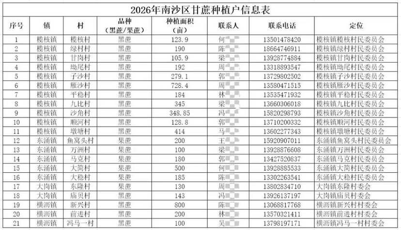 采购商或市民可查看下方“南沙区甘蔗种植户信息表”,前往附近的农户采购甘蔗,表内甘蔗田头价格为每公斤1元。