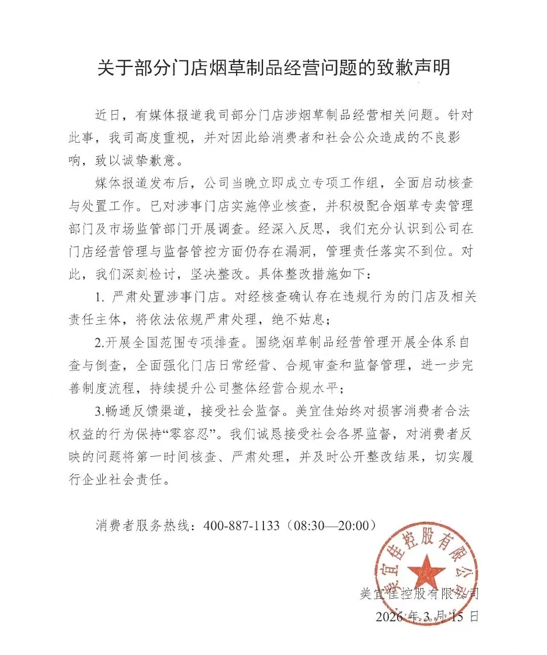 美宜佳3月15日就部分门店烟草制品经营问题发出致歉声明,并对因此给消费者和社会公众造成的不良影响,致以诚挚歉意。同时称公司高度重视,当晚立即成立专项工作组,全面启动核查与处置工作。已对涉事门店实施停业核查,并积极配合烟草专卖管理部门及市场监管部门开展调查。经深入反思,充分认识到公司在门店经营管理与监督管控方面仍存在漏洞,管理责任落实不到位。对此深刻检讨,坚决整改。
