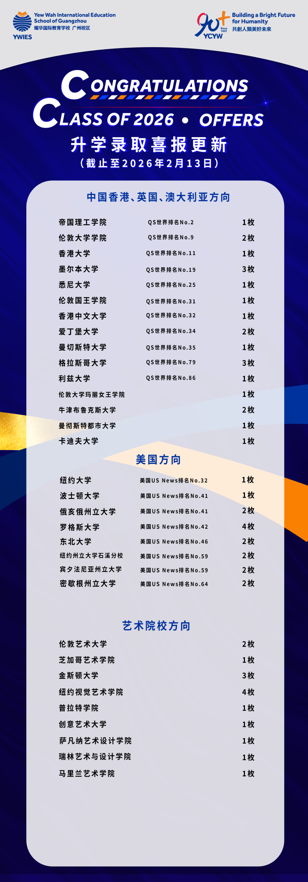 在此十余年里,我们的学生在剑桥国际考试中取得了累累硕果,八届毕业生更是获得包括牛津大学、剑桥大学、帝国理工、纽约大学、香港大学等顶尖大学的录取。