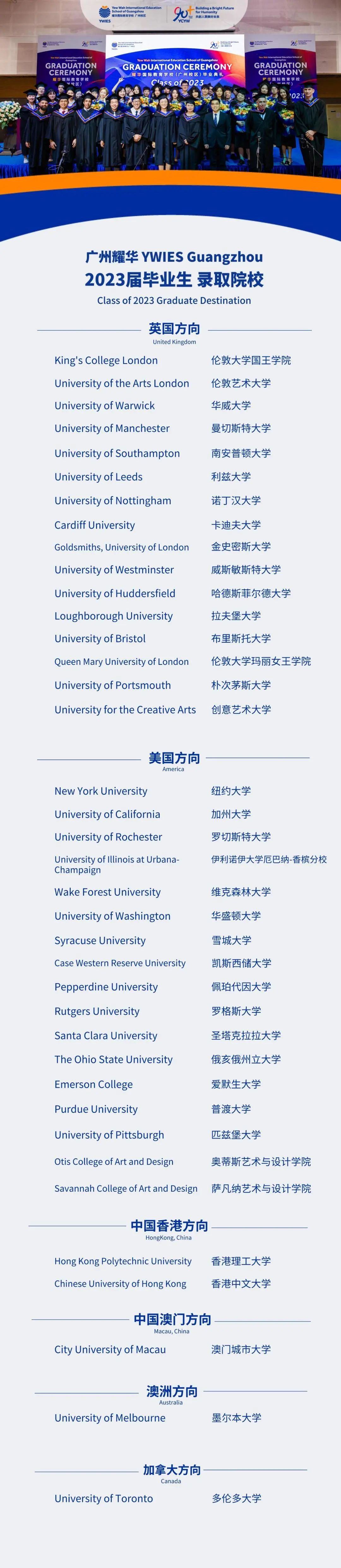 广州耀华帮助学生克服申请海外大学过程中的种种困难,包括学业成绩和申请手续上的全面准备。学校的升学辅导教师还会为学生提供个别的海外升学辅导,发掘他们的需要和兴趣,协助他们订立目标,并指导学生选择及申请合适的大学及专业。通过耀华广阔的海外大学联系网络,耀华的历届毕业生获得众多世界知名大学的录取。