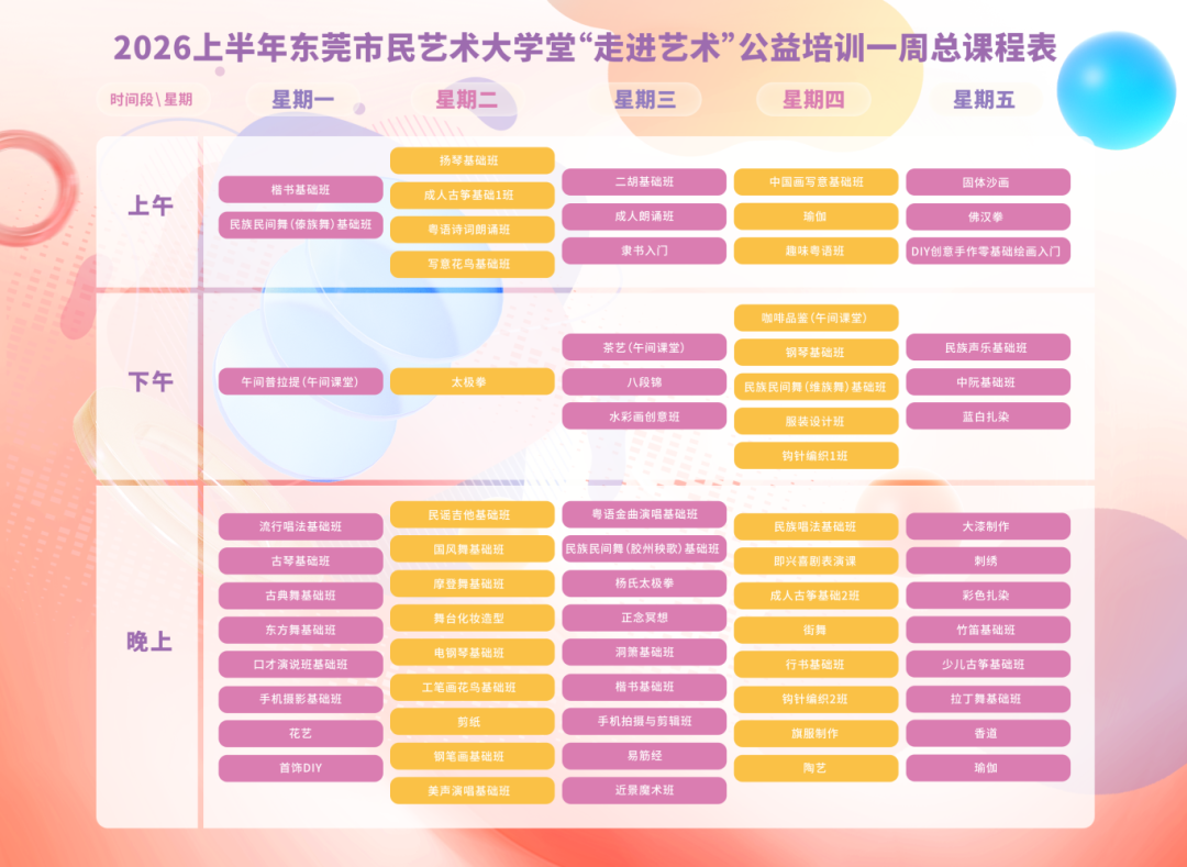 课程分为日校基础班和夜校基础班。内容涵盖书画、舞蹈、声乐、戏剧和茶艺、花艺、瑜伽等多个类别。