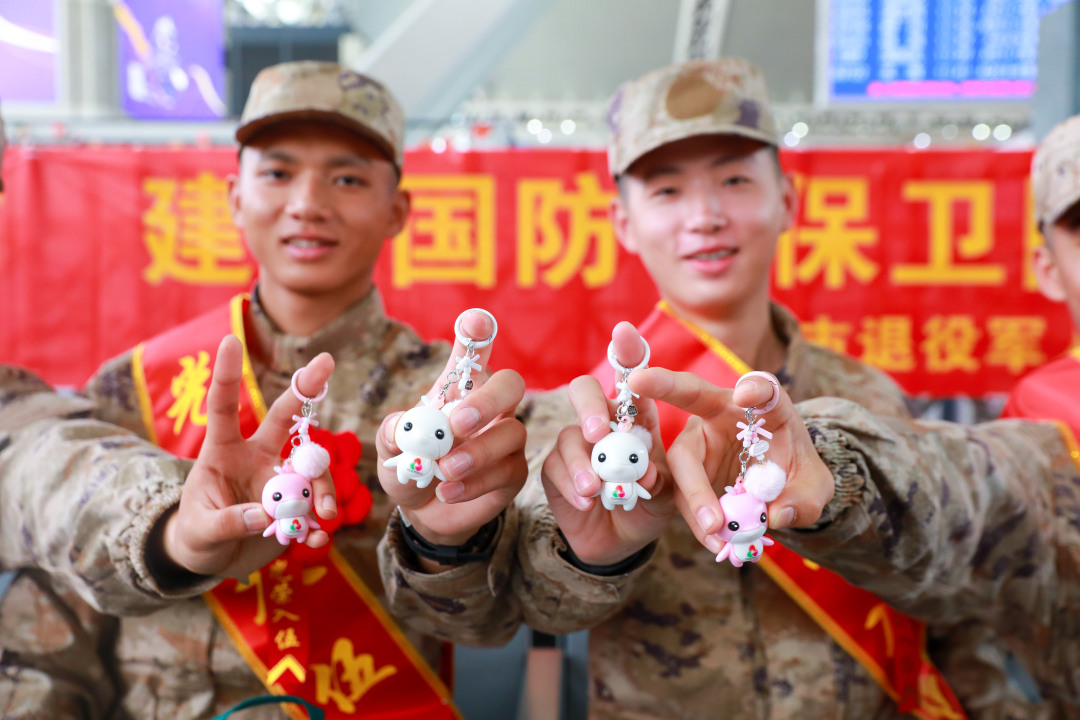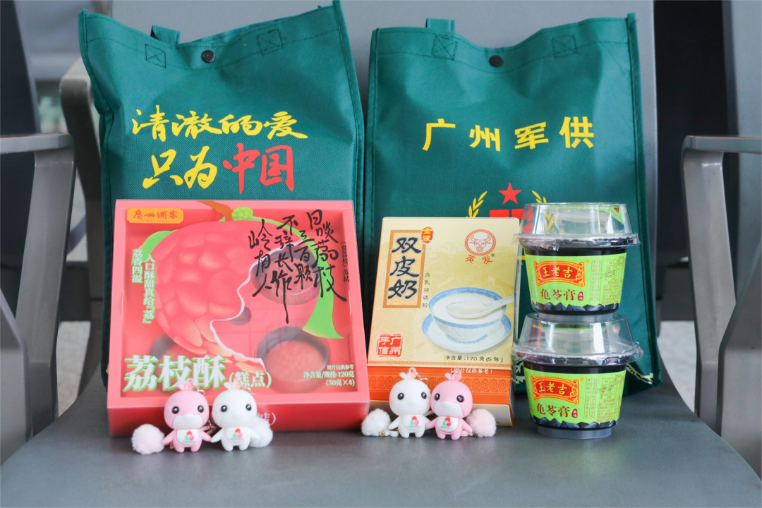 更令新兵们惊喜的是,每人还收获一份“广州军供手信”礼盒。礼盒内不仅有荔枝酥、双皮奶、龟苓膏等承载岭南风味的特色小吃,更藏着当下的“顶流明星”——第十五届全运会吉祥物“喜洋洋”“乐融融”的文创产品。一枚小小的钥匙扣,串联起全运活力、湾区同心与强军使命,更寄托着“喜气洋洋进军营,其乐融融守家国”的深厚祝福,成为新兵们奔赴军营的特殊纪念。