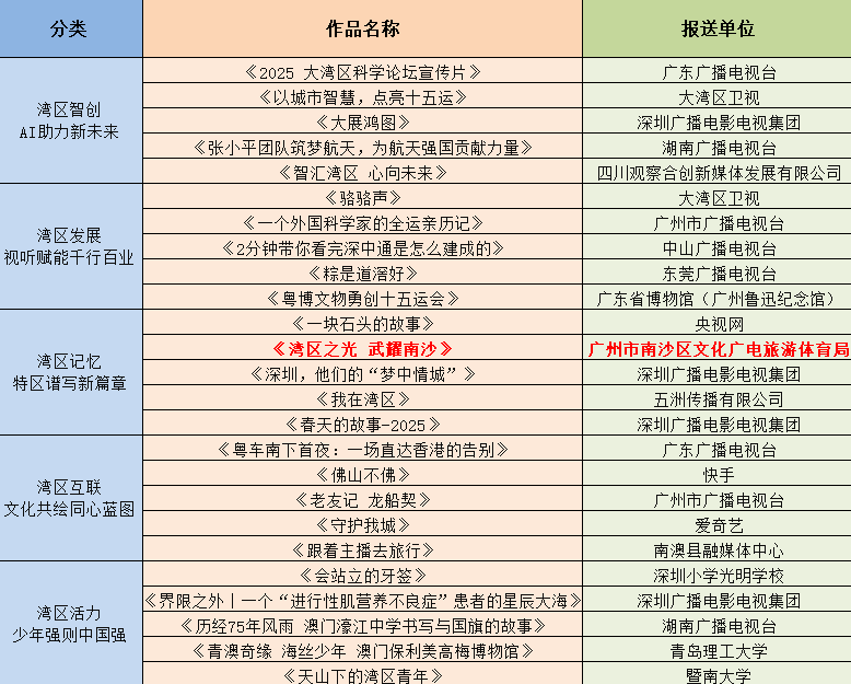 “大湾区之光”短视频征集展播活动生动记录了粤港澳大湾区的发展脉动与人文魅力。本届活动推荐作品名单如下: