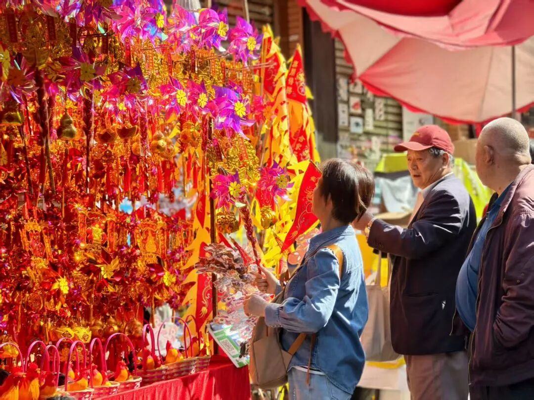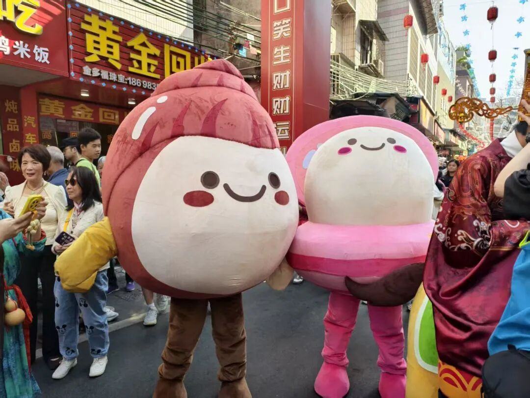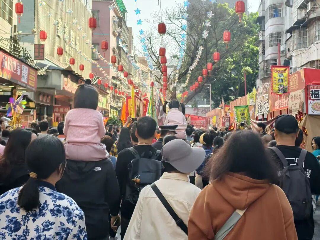 现场,以铜钱、生菜、田螺等为吉祥物形象的人形公仔也同步亮相加入巡游,与市民热情互动。传统庙会融入潮流表达,老少皆宜、趣味十足,市民游客纷纷举起手机拍照留念。沿街市集汇聚广府小吃、非遗手作、文创好物等,风车、福袋、民俗工艺品琳琅满目,市民逛吃赏玩,沉浸式感受广府市井烟火气。