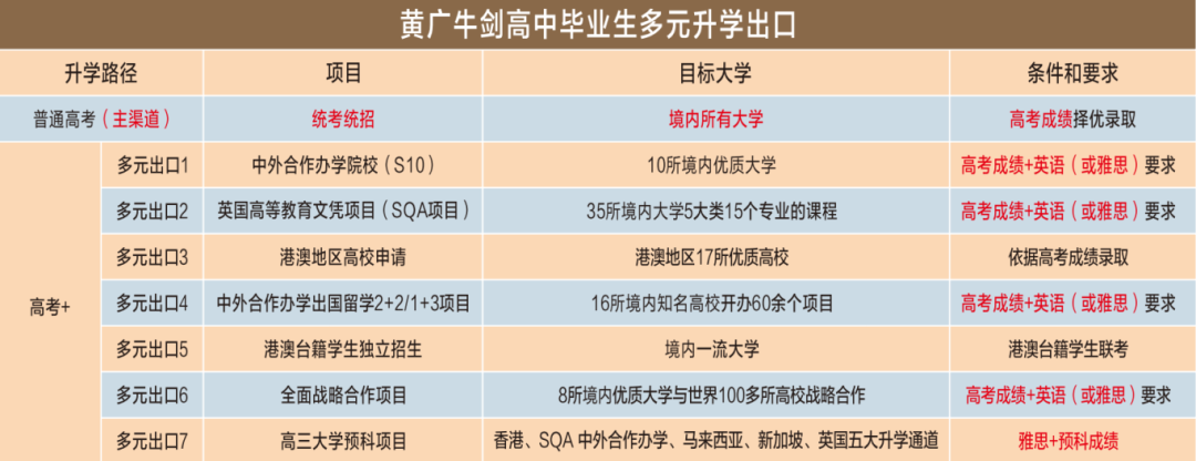 这是黄广牛剑高中的重要办学特色。学校在开齐开足普通高中课程的基础上,增设了多元化校本课程,在保障学生参加国内高考的同时,还提供7种境内外升学选择,助力学生根据自身特点规划未来。