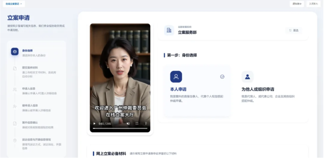 据了解,新系统首页新增操作指引视频,直观讲解全流程与材料要求;立案流程精简为六大步骤,搭配实时进度条,已填信息可随时修改,杜绝漏交、反复修改问题。