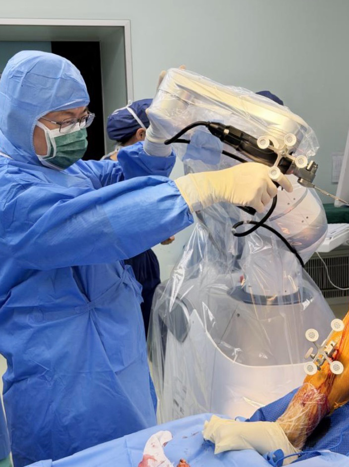 此次手术由柴伟主任主刀,为一名61岁的女士实施了机器人辅助右侧全膝关节置换手术。10年来,这位女士的右侧膝内侧间隙烧灼样疼痛持续发作,久行、久站后症状加重。尽管她曾接受过玻璃酸钠注射治疗,但最近两年疼痛加剧,活动受限明显加剧,严重影响生活质量,亟需手术干预。考虑到她无基础疾病,手术耐受良好,对假体植入精度与术后功能恢复要求极高,经综合评估,医疗团队决定借助HX机械臂骨科机器人赋能,为她实施右侧全膝关节置换术。术后,她恢复良好,顺利出院。