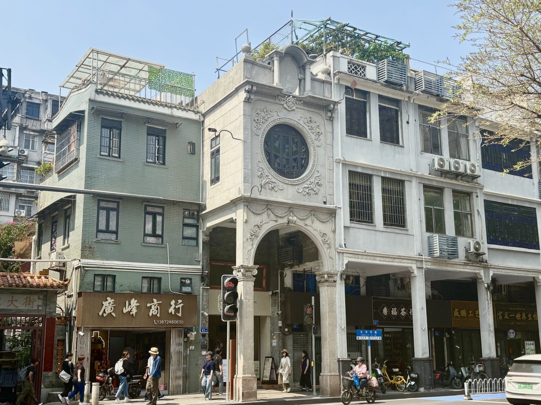 广州荔湾区宝源路与龙津西路的T字路口,有一座老建筑堪称广州历史建筑爱好者心目中的“白月光”——龙津西路83号、荔湾区登记保护文物单位富兴大押旧址。一直以来,它凭借着巨型圆形雕花木窗、半圆拱门、浮雕花卉等华丽外观,以及20世纪初期广州六大当铺之一、唯一一座骑楼式当铺的过往,吸引着众多历史建筑爱好者,甚至有人奉之为西关典当建筑的“颜值天花板”,专门为其设计微缩模型。近日,紧锁大门多年的富兴大押旧址开放,这间西关大屋被活化为能饮早茶的长者饭堂,面向公众试业。