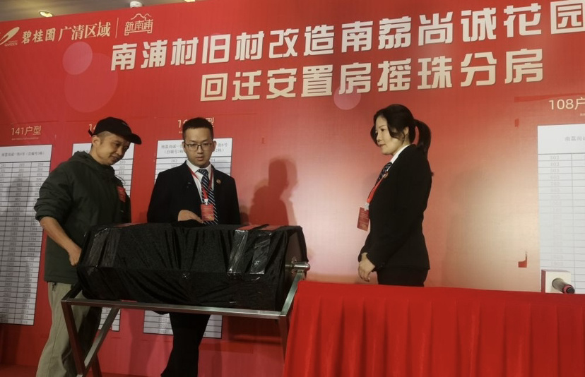3月14日,广州市番禺区石碁镇举行南浦村旧村改造项目安置房摇珠分房活动,2244套新房确定主人,村民们期盼已久的回迁安居梦迎来重要时刻,广州市公证处、番禺区城市更新局、石碁镇主要领导、镇有关部门、相关村工作人员以及村民等参加活动。