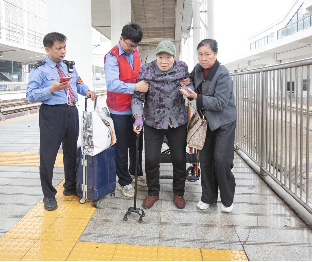 广州北站值班员毕济勇与志愿者一道帮助90多岁高龄老人出站。和匀生摄