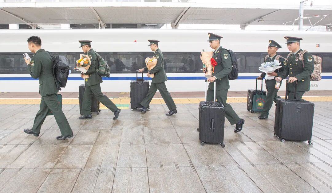春运期间的高铁站台上,一道格外亮眼的风景引人注目:一批又一批退伍军人从高铁上走下来,他们身披印着“光荣退伍”字样的绶带,手中捧着鲜艳的鲜花,身姿挺拔,目光坚定。那抹象征荣誉的绶带与绽放的鲜花交相辉映,既透着军旅生涯的坚毅,又带着归乡的温情,成为站台上最动人的画面。-和匀生摄