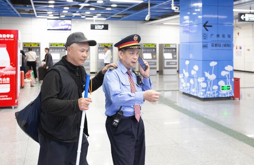 广州北站值班员毕济勇帮助盲人出高铁站并护送至地铁站换乘。-和匀生摄
