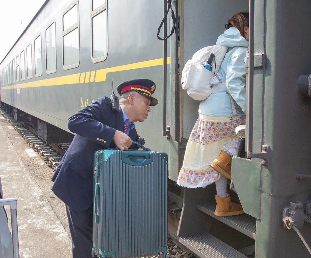 站台值班人员帮助旅客上行李-和匀生摄