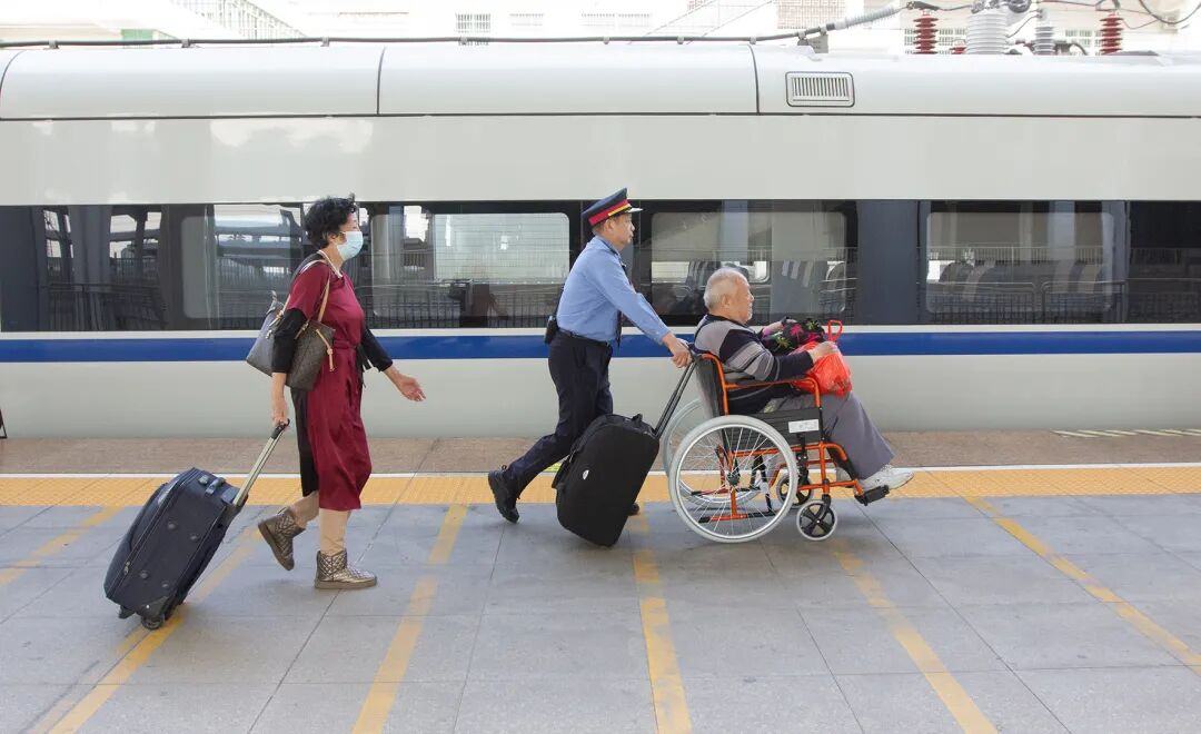 广州车站提供轮椅帮助残障老人上下车。一路春风暖人心-和匀生摄