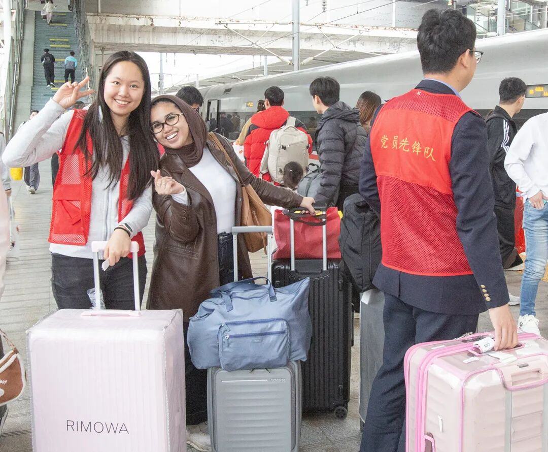 从马来西亚飞广州然后从广州北站乘高铁转去上海上学的马来西亚学生Im echy,她有五个行李箱,进站上车相当困难,全得车站志愿者帮助。-和匀生摄