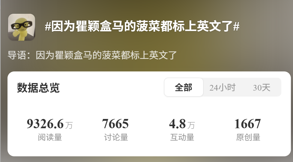 瞿颖在Papi酱直播节目里讲的一个在泰国买菜段子这两天刷屏了,以至于盒马生鲜也玩起了梗,在APP的菠菜销售页特别标注了“菠菜spinach”,让网友又欢乐了一把,让#因为瞿颖盒马的菠菜都标上英文了#又登上了热搜。