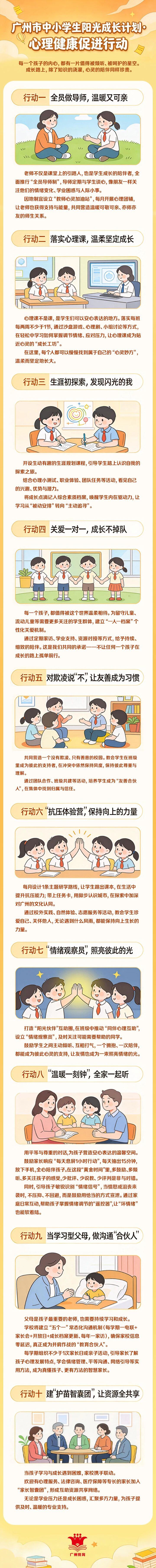 阳光成长计划明确,广州将建成广州市中小学生阳光成长中心,建设市中小学生阳光成长服务平台;有效整合“粤心安”“舒心驿站”“青年地带”等社会服务资源;利用在穗高校、科研院所资源,深化中小学生身心健康相关调查研究与成果应用;支持、规范社会第三方机构及专业社工、志愿者等开展儿童青少年心理健康服务;会同卫生健康委、公安、网信等部门健全联动协作机制,建立转介就医绿色通道,完善学生休学复学机制。