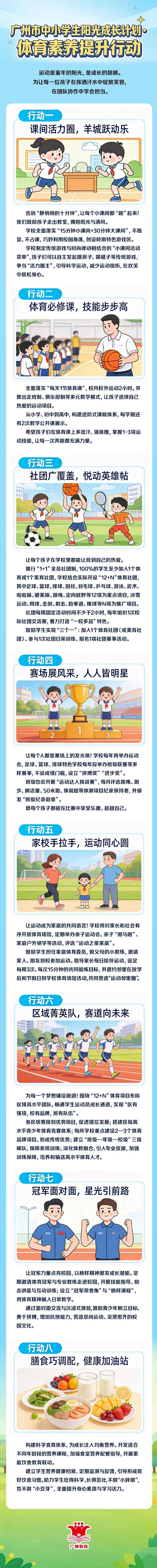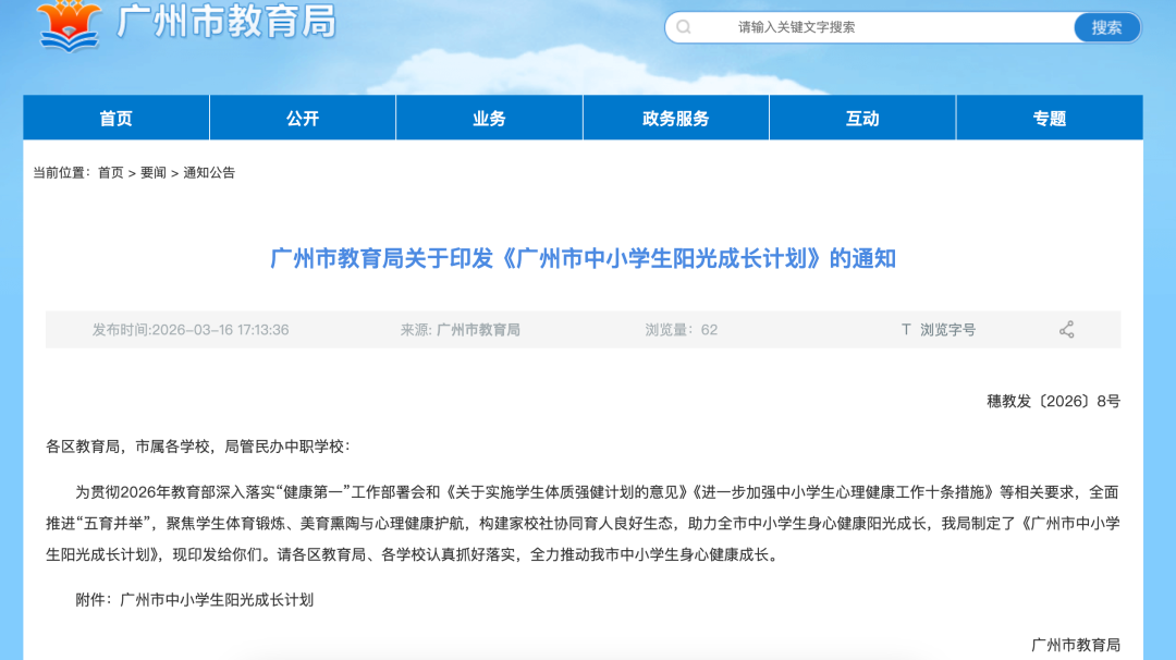 3月16日,广州市教育局官网发布关于印发《广州市中小学生阳光成长计划》(以下简称“阳光成长计划”)的通知。通知显示,阳光成长计划包括体育素养提升行动、美育素养绽放行动、心理健康促进行动,从体育、美育、心育、融合共育等维度,助力全市中小学生身心健康阳光成长。