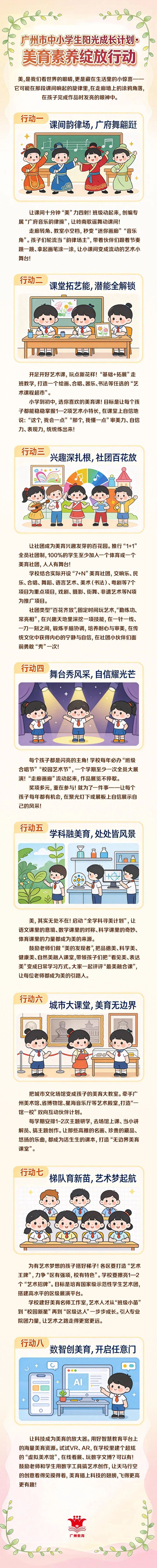 在美育浸润方面,阳光成长计划提出,坚持“面向全体学生,人人享有艺术”工作思路,确保音乐、美术、书法等课程课时,逐步拓展舞蹈、戏剧、影视、非遗等艺术形式;探索跨学科美育融合,帮助每一名学生掌握1-2项艺术特长,培养学生审美能力;常态化开展合唱、合奏、集体舞、书画摄影等群体性艺术活动;建设多样化学生艺术社团,确保每一名学生加入至少1个社团;推进高雅艺术、优秀传统文化、非遗进校园活动,传承粤语、粤曲、粤剧等广府(岭南)文化。