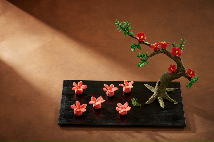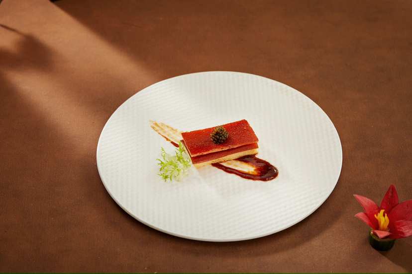 “创新”,创的是“以一花融百味”的当代表达。“油醋汁豚肉午笋鱼”,以红棉花汁调和意式油醋汁,让海陆珍鲜在同一盘中对话;“云开珠水映朝霞”,麻皮乳猪红润如霞,铺陈于烤脆的面包片上,红棉花慢熬成酱添红火,鱼子酱点睛提鲜——这是粤菜技艺与全球食材的从容对话。