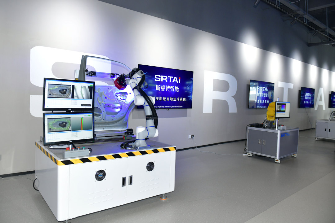 在园区A2栋,广州市斯睿特智能科技有限公司的展厅里,一排排工业机器人正向大家演示着内嵌智能体的涂胶检测、轨迹生成等高柔性操作。这家成立八年的国家级高新技术企业、广东省专精特新企业,一直以来致力于为制造业提供领先的工业AI解决方案。