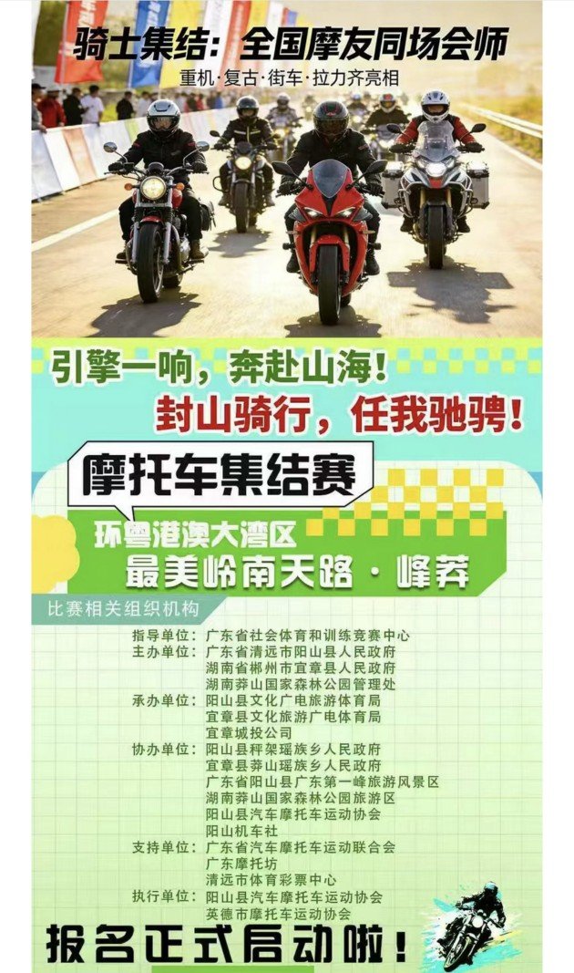 2026年3月16日,环大湾区最美岭南天路·峰莽摩托车集结赛正式开启全国招募,这场横跨湘粤两省的摩旅盛会将于3月21日至22日在广东省清远市阳山县广东第一峰旅游风景区拉开帷幕。