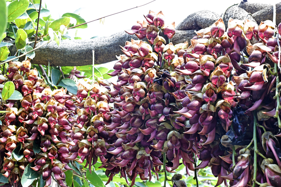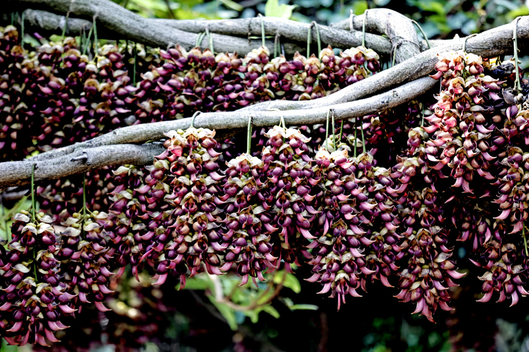 只要有藤,便结成串,开满花,花穗如葡萄般排成行垂在半空,有的甚至伸到湖面上,随着湖光银闪的映照,更显得异常夺目。树身向四周延伸,藤蔓绕着水泥结构的走廊攀爬生长。这片禾雀花开得奔放、随性、激烈,极具有张力,似乎要将整个生命都献给春天。