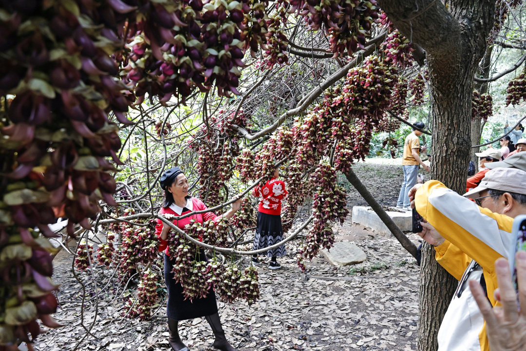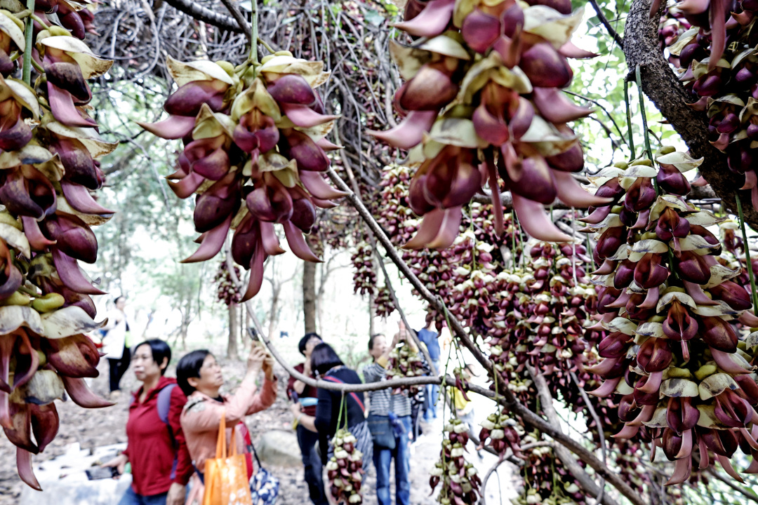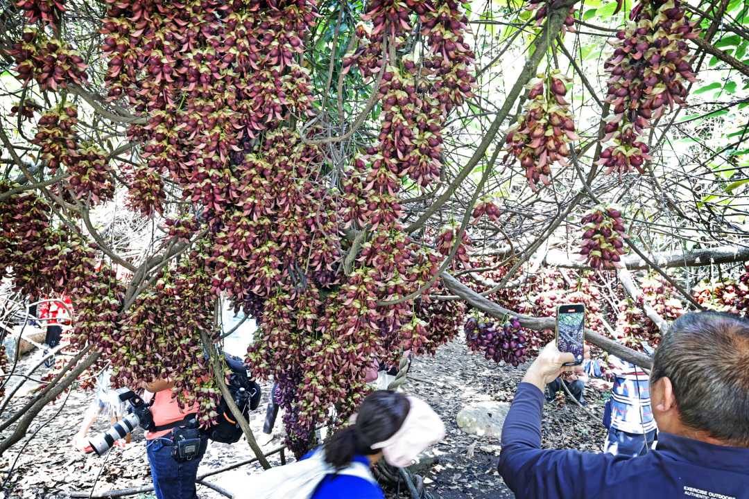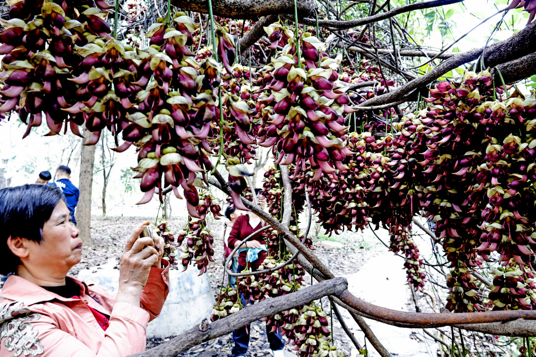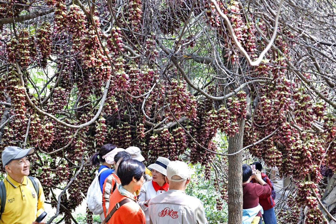 春意盎然,近日华南农业大学里可谓是满园春色,赏花的人在周末更是络绎不绝。校园鄱阳湖华瑞亭旁边,一片禾雀花开得相当灿烂,吸引了许多市民闻讯而至。