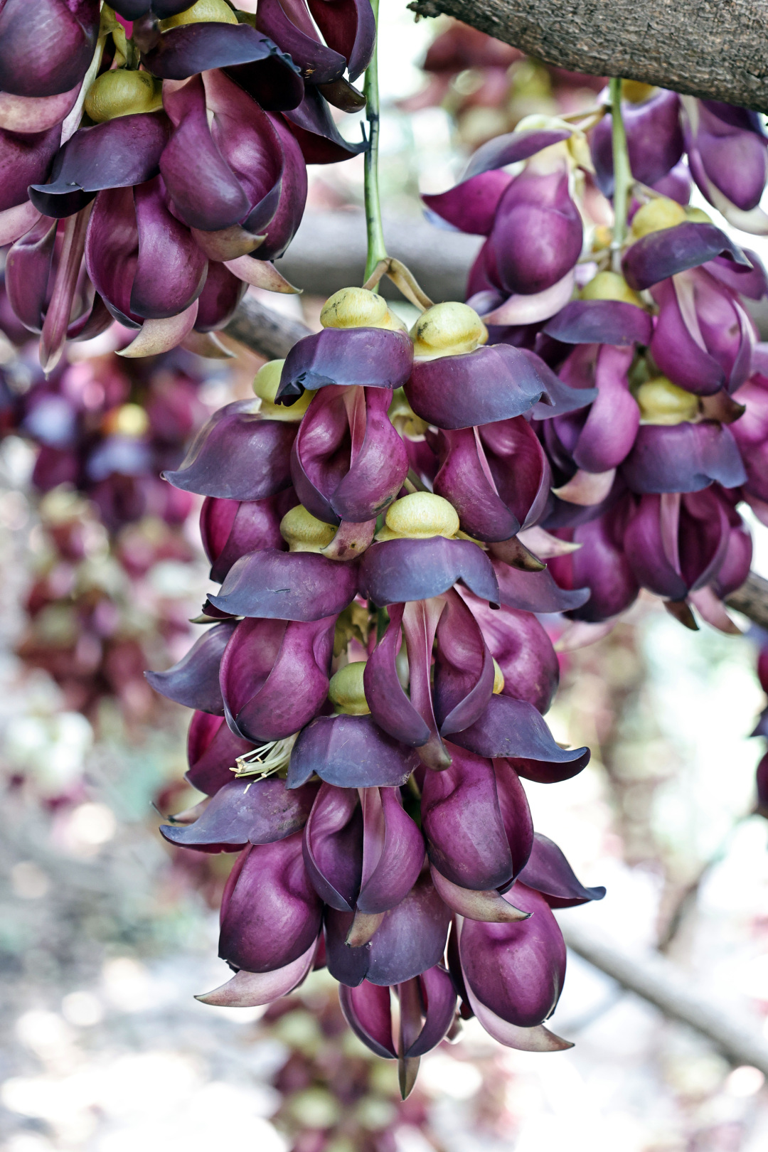 远远望去,林荫下人影攒动,在紫色禾雀花下来回走动,观赏、留影。赏花人一边赞叹美不胜收,一边美滋滋地拍个不停,个个流连忘返。那紫色的禾雀花个挨个,串连串,组成整片,层层叠叠从树上倾泻而下,宛如瀑布飞落,俨然就是“禾雀”栖居的老巢。