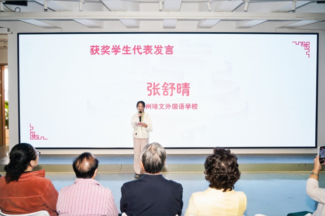 获奖学生代表张舒晴今年13岁,她以清澈而坚定的声音,道出了所有获奖孩子的心声:“国风少年,是根植于传统文化的少年意气,是用当代笔触书写东方之美的初心。我们以汉字为骨、以丹青为韵,在创作中感受国风之美,在表达中彰显少年担当。”她向许钦松爷爷、基金会、老师和父母致以诚挚谢意,并表示这份一等奖是对她努力与热爱的肯定。最后,她向所有同龄伙伴发出倡议:“同学们,我们虽作品不同,却都心怀热爱。愿我们继续以笔为伴,用笔墨绘出最美的童年,传承国风!”