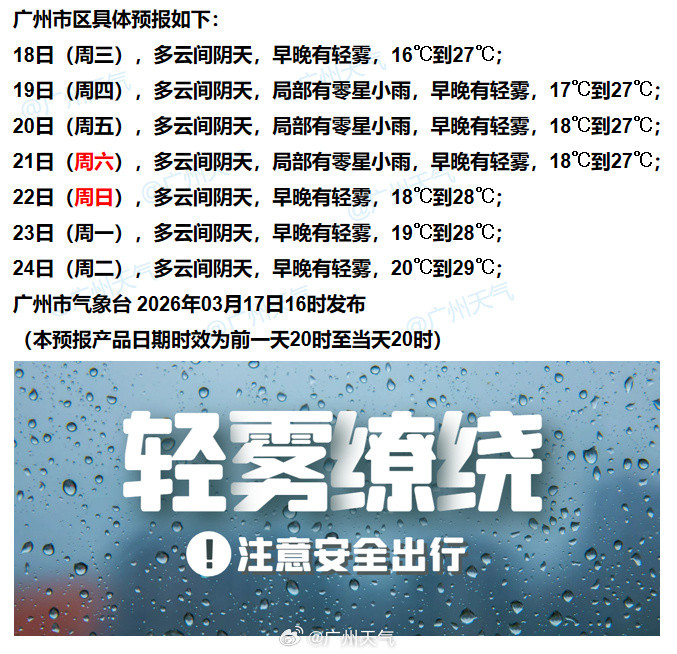 广州市气象台预计,预计未来三天,受东南气流影响,云量逐渐增加,早晚有轻雾,部分地区有零星小雨,最低气温逐渐上升,最高气温维持27℃左右。