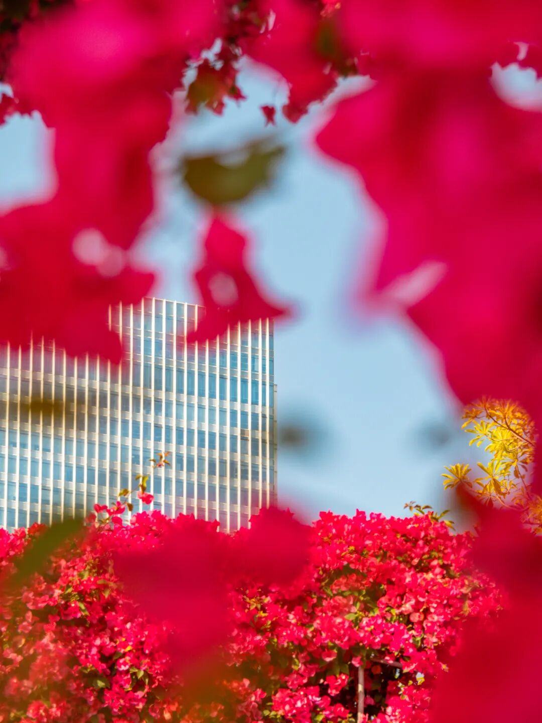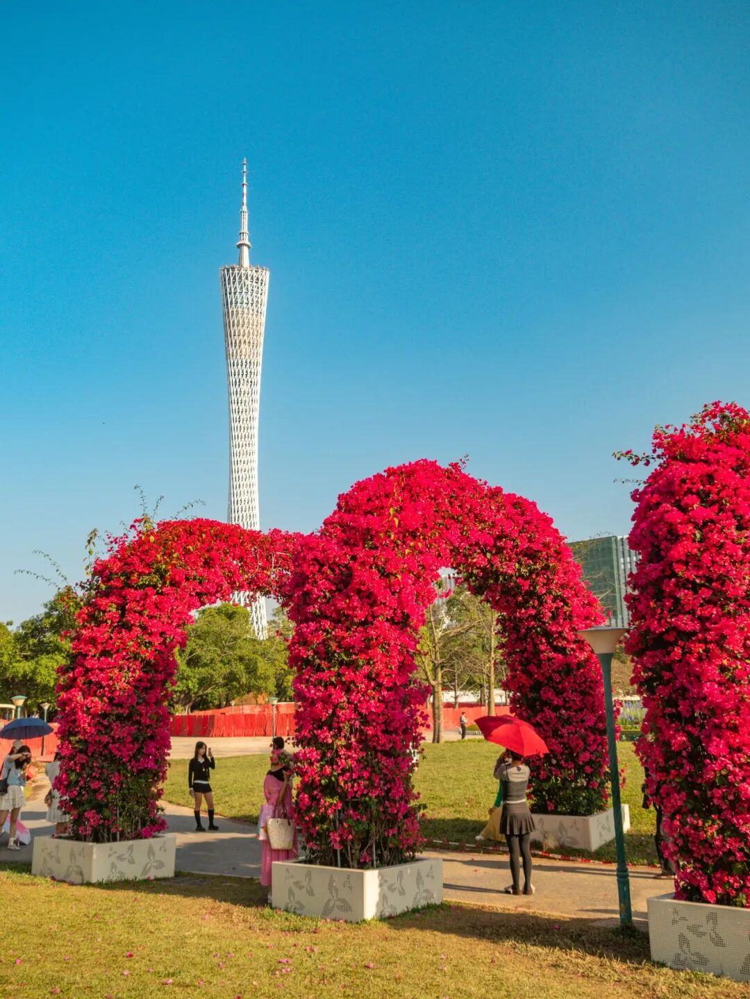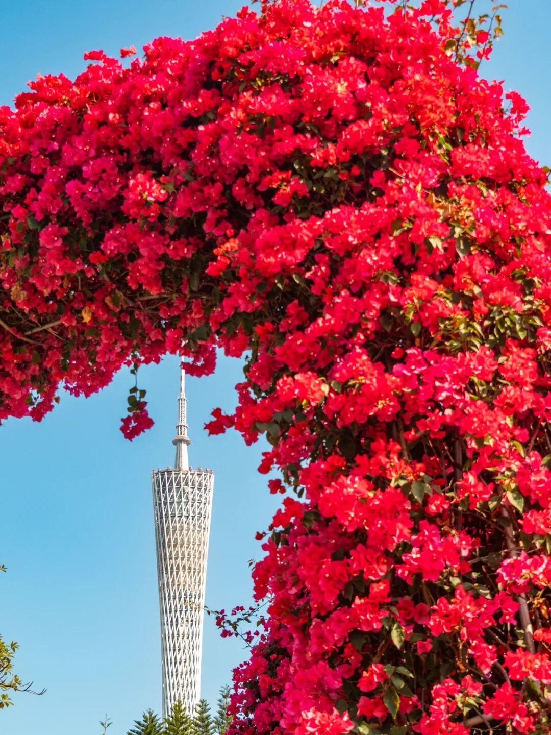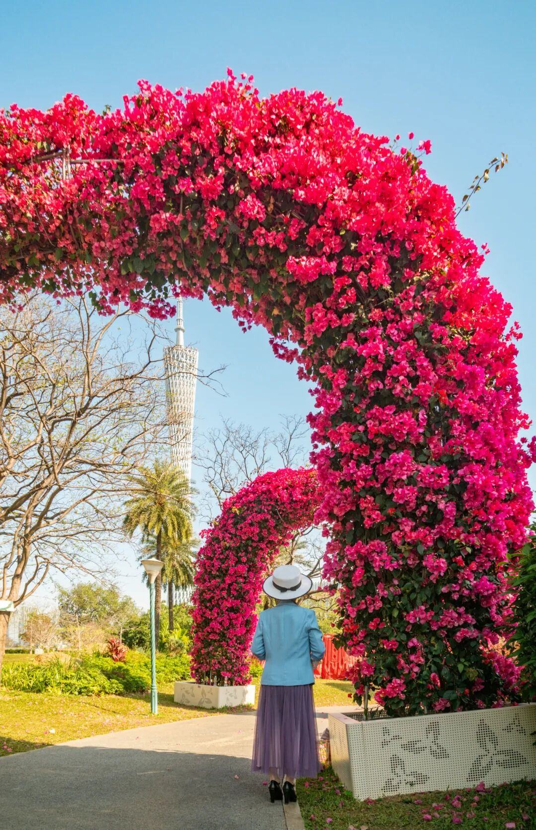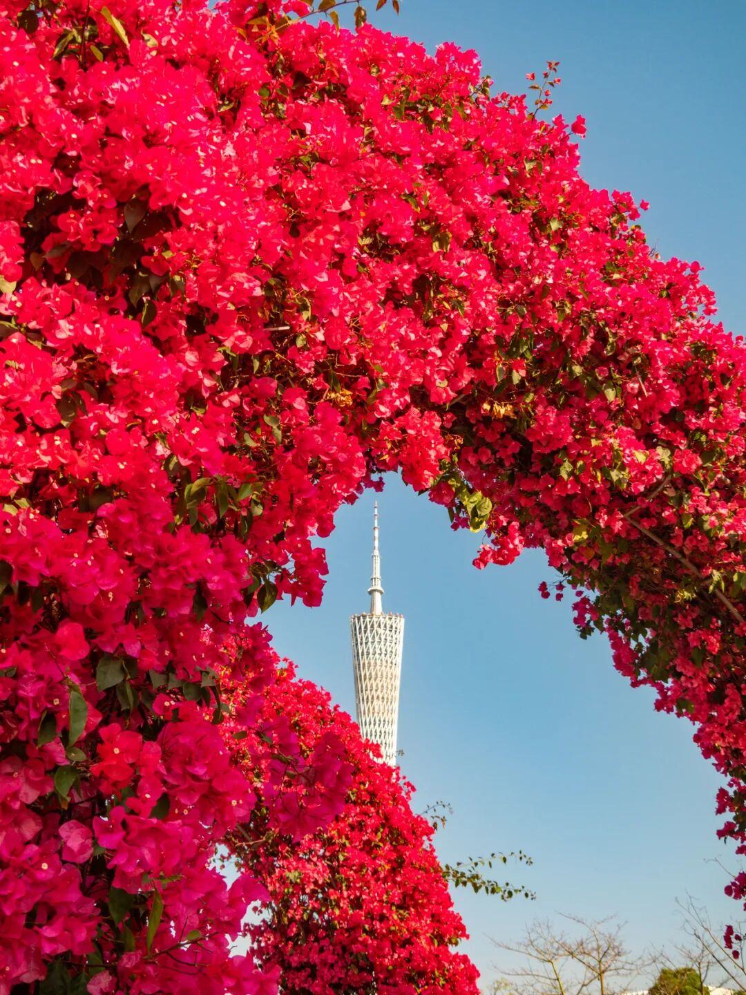 抬头望去,簕杜鹃拱门的弧线正好可以把远处的“小蛮腰”给“框”起来。你可以拍到一张带地标的唯美照片。