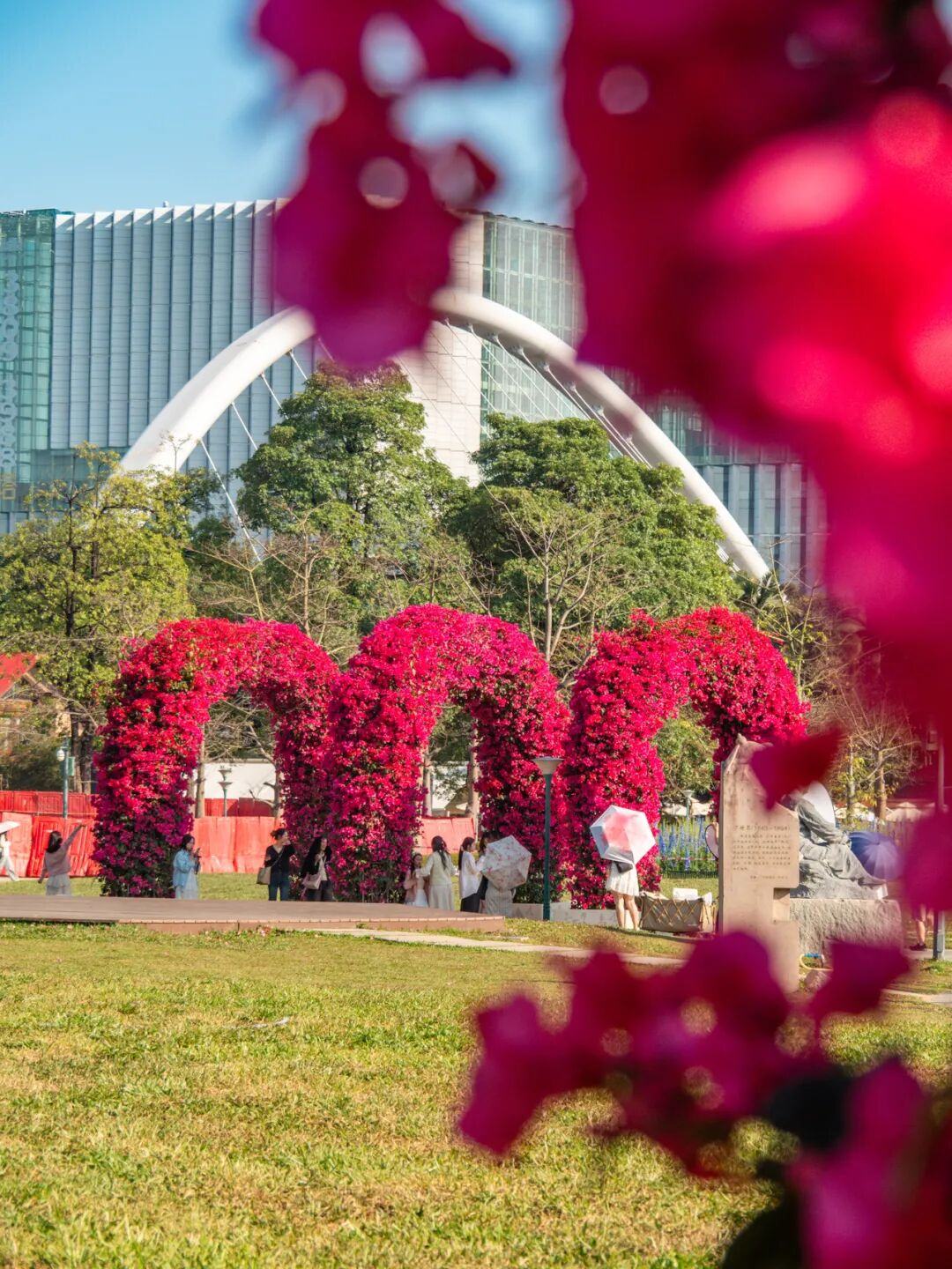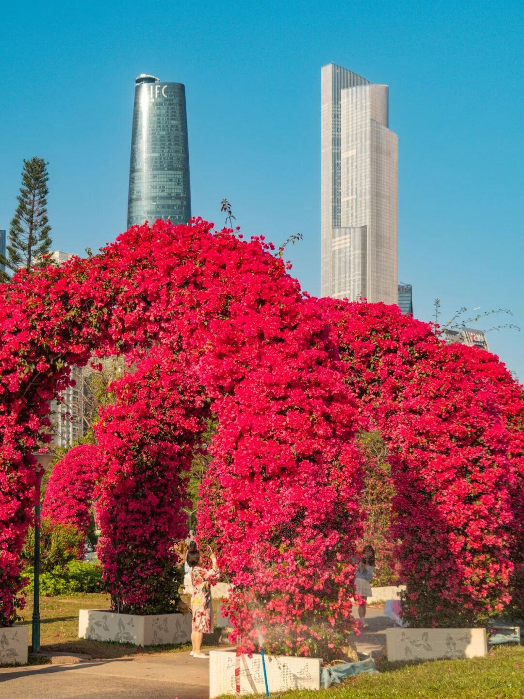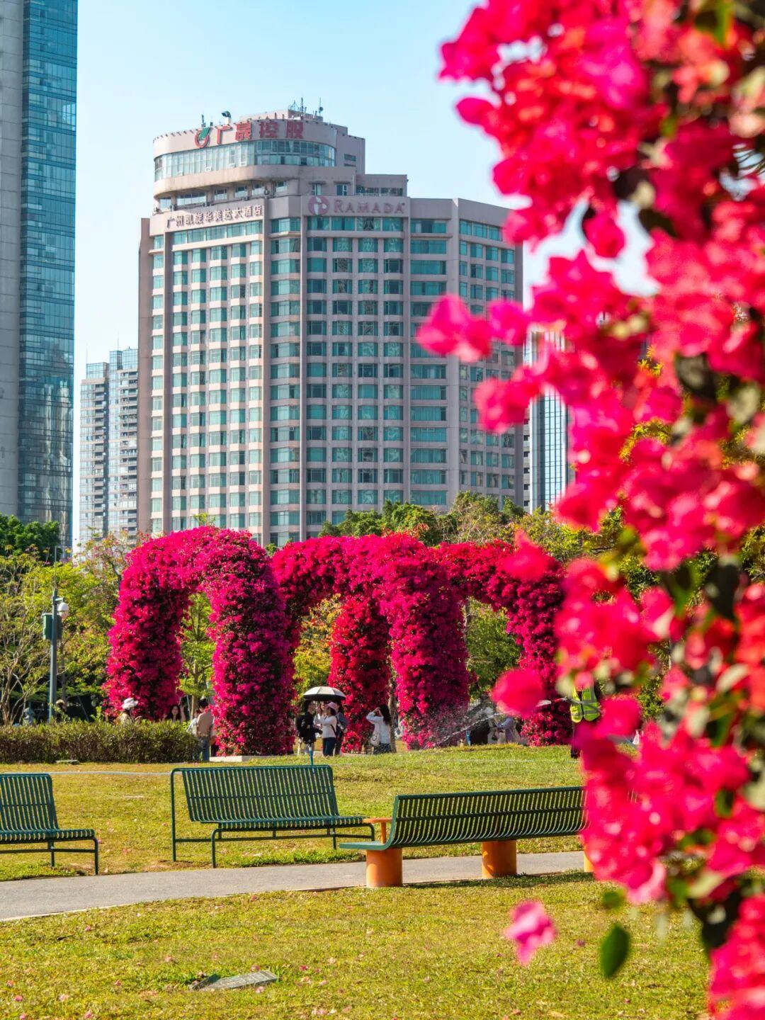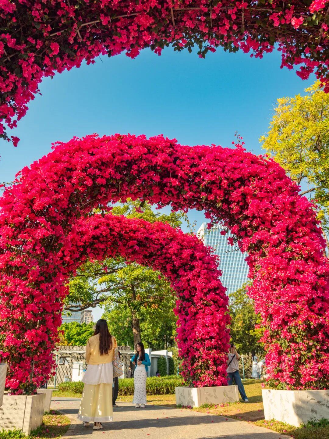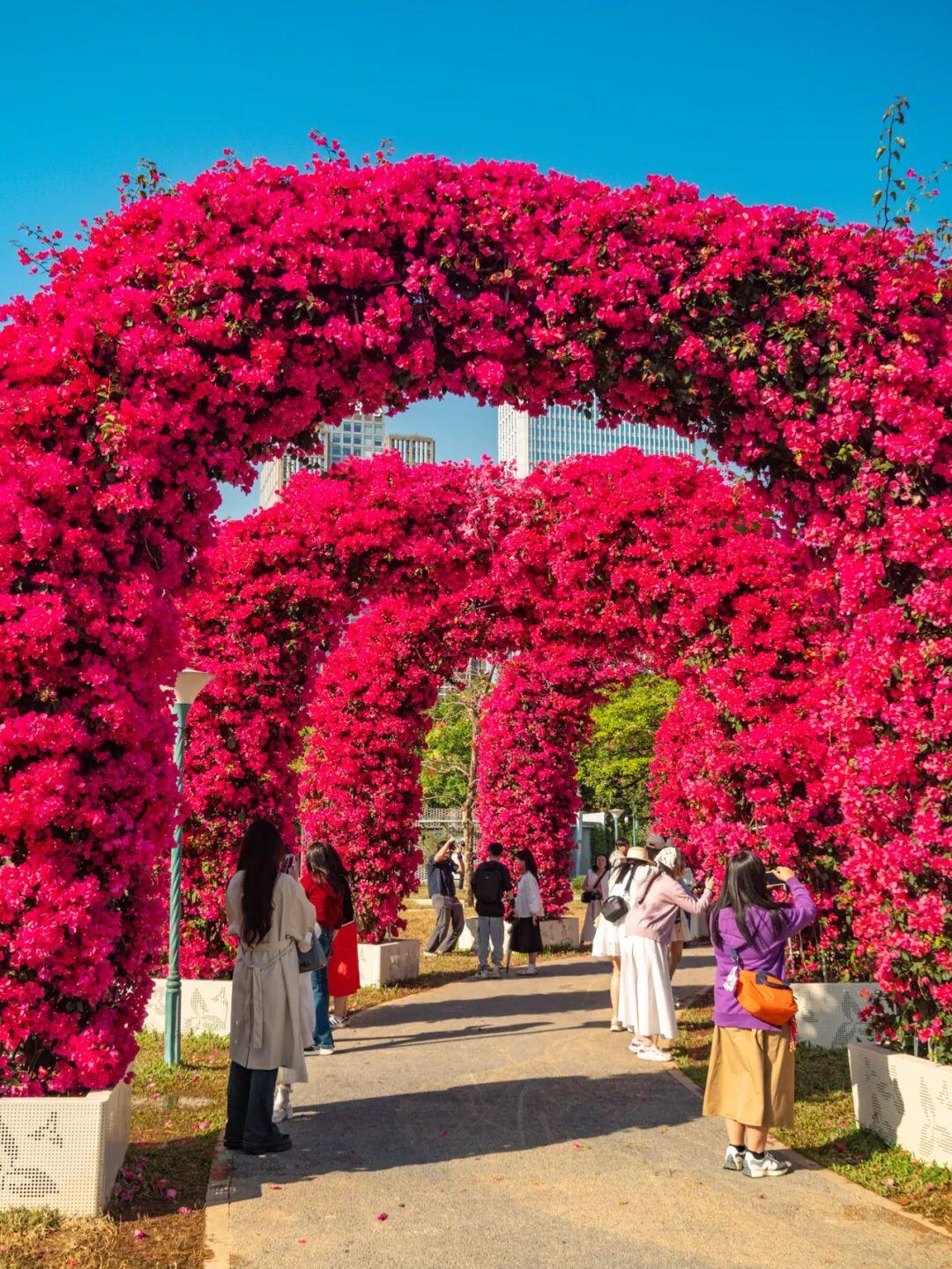 步入二沙岛宏城公园深处,一排精心打造的簕杜鹃拱门映入眼帘。