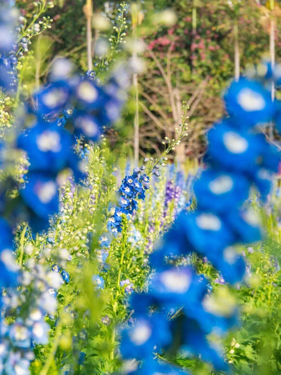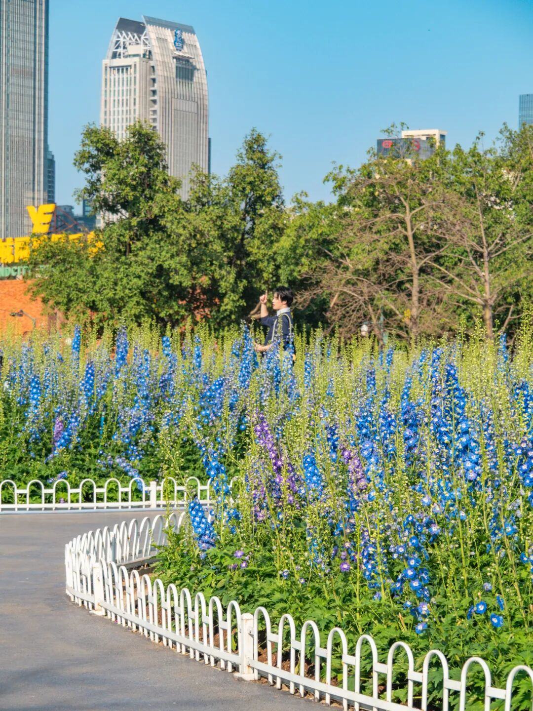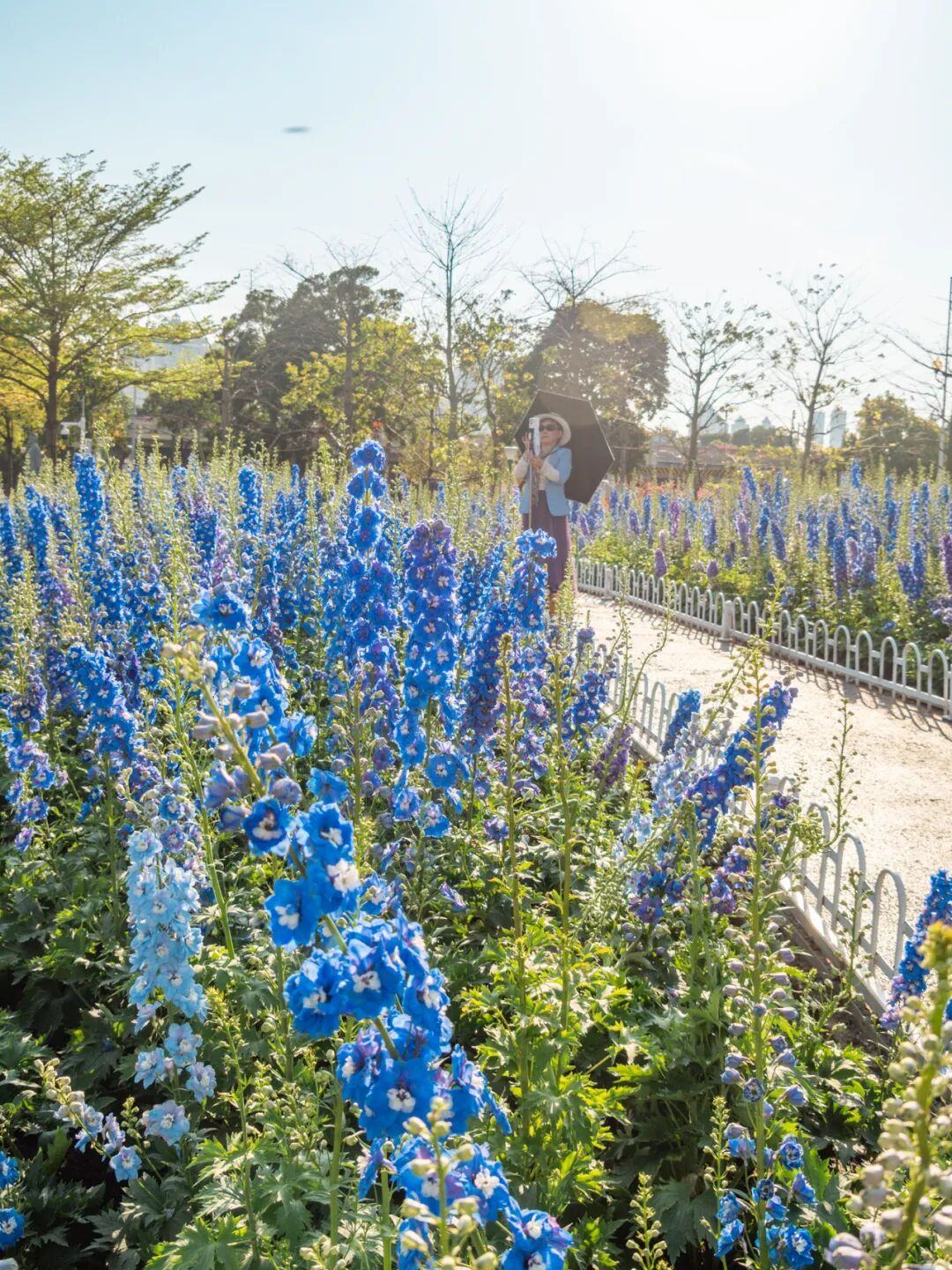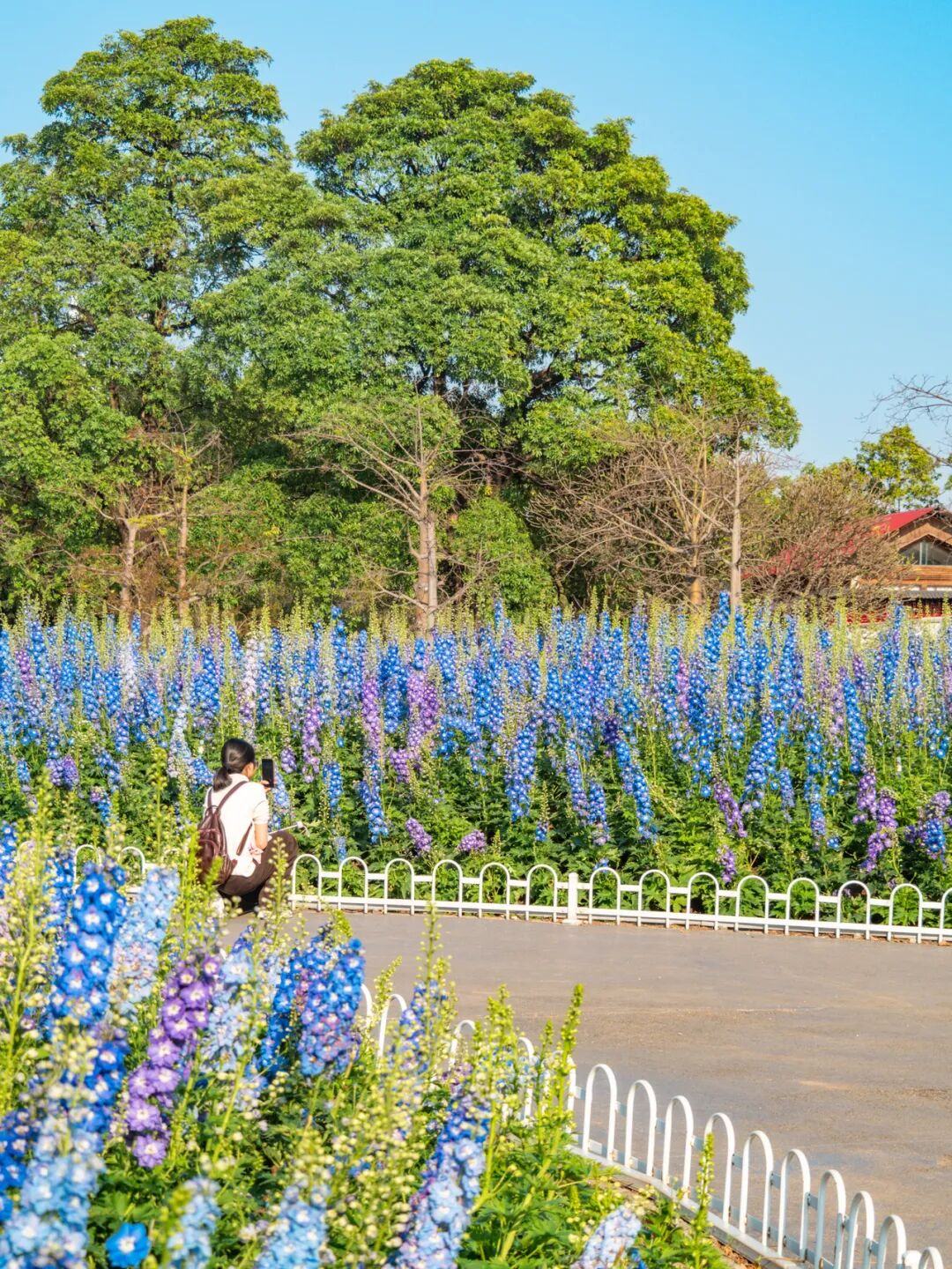 这一边是热烈奔放的簕杜鹃,公园另一侧则是悄然盛放的大花飞燕草。