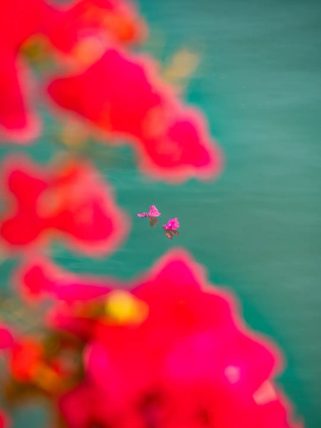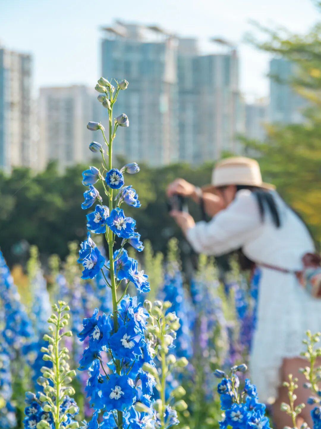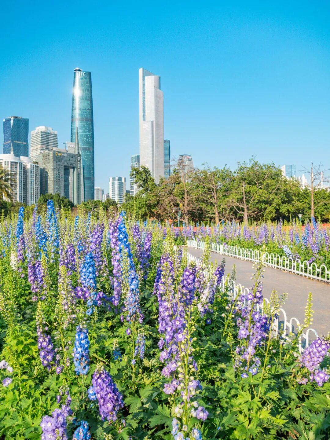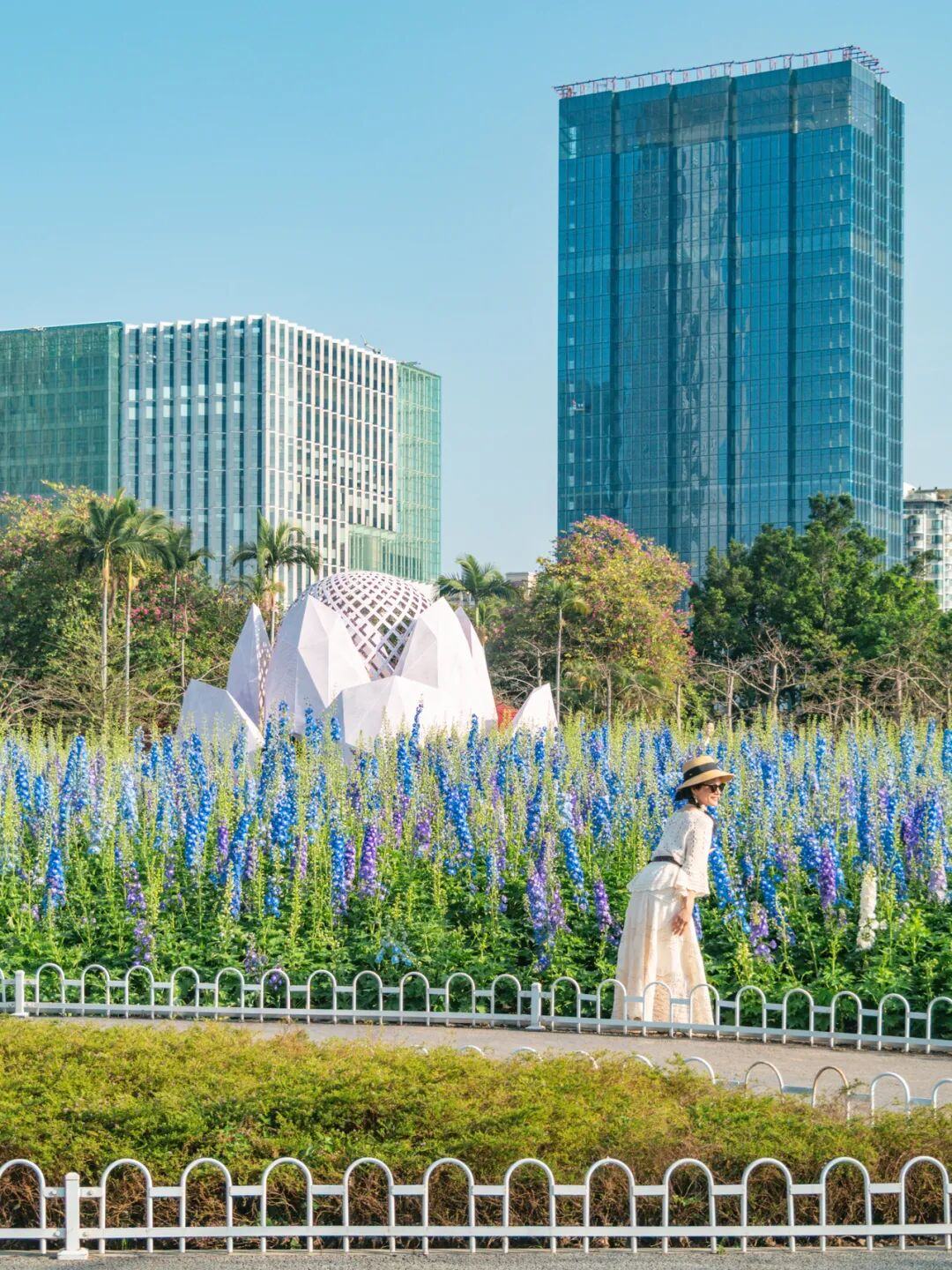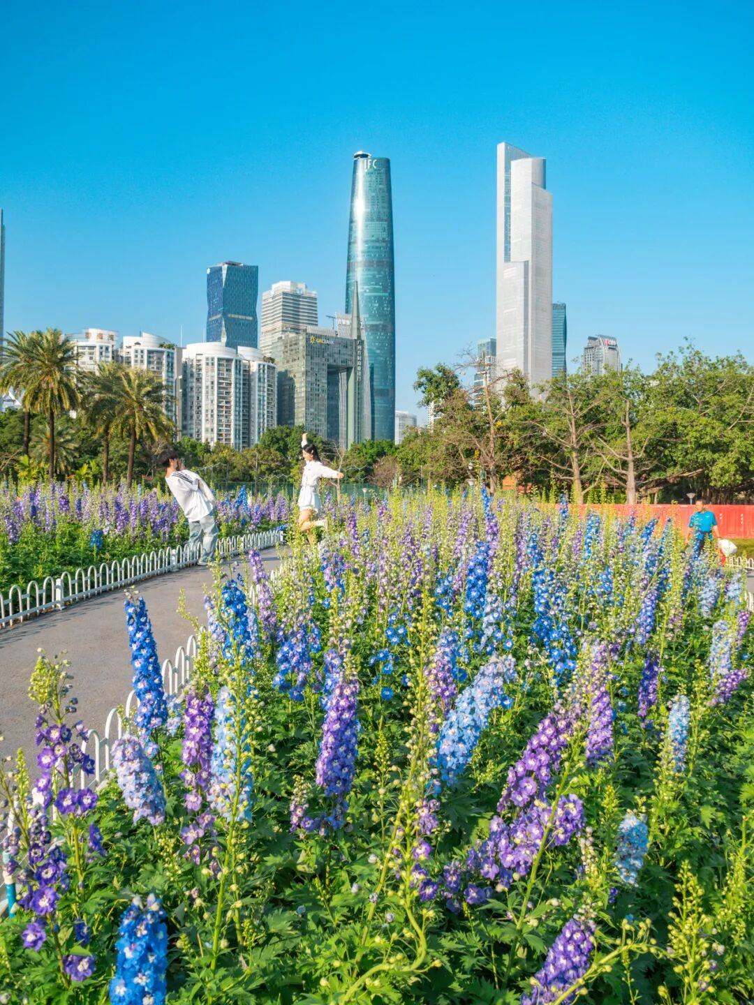这一边是热烈奔放的簕杜鹃,公园另一侧则是悄然盛放的大花飞燕草。