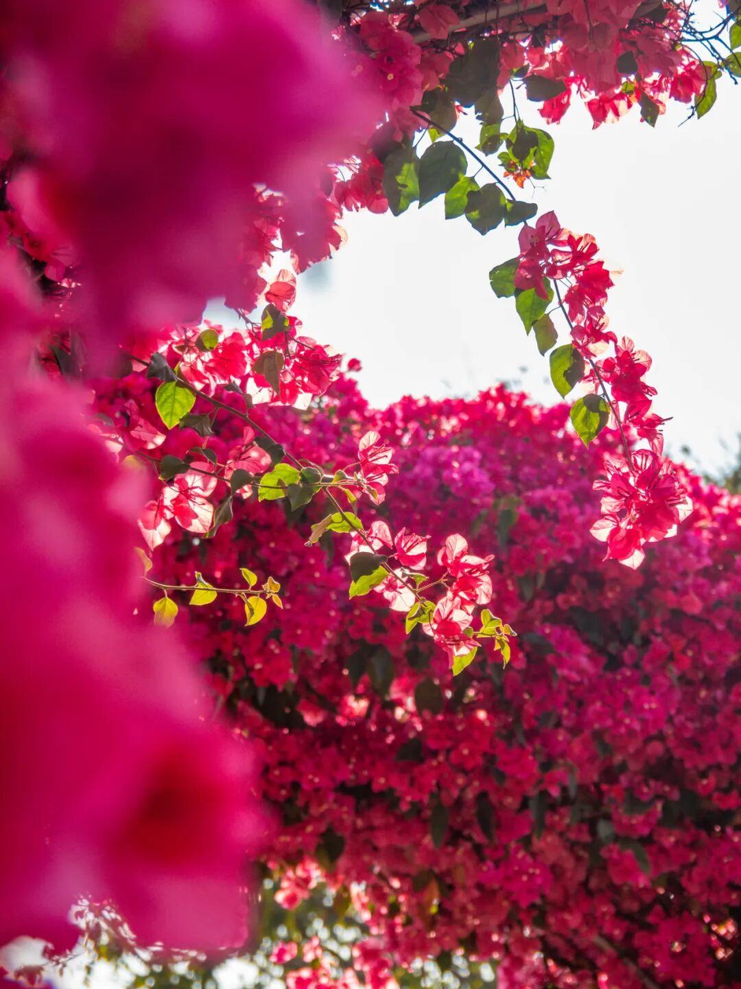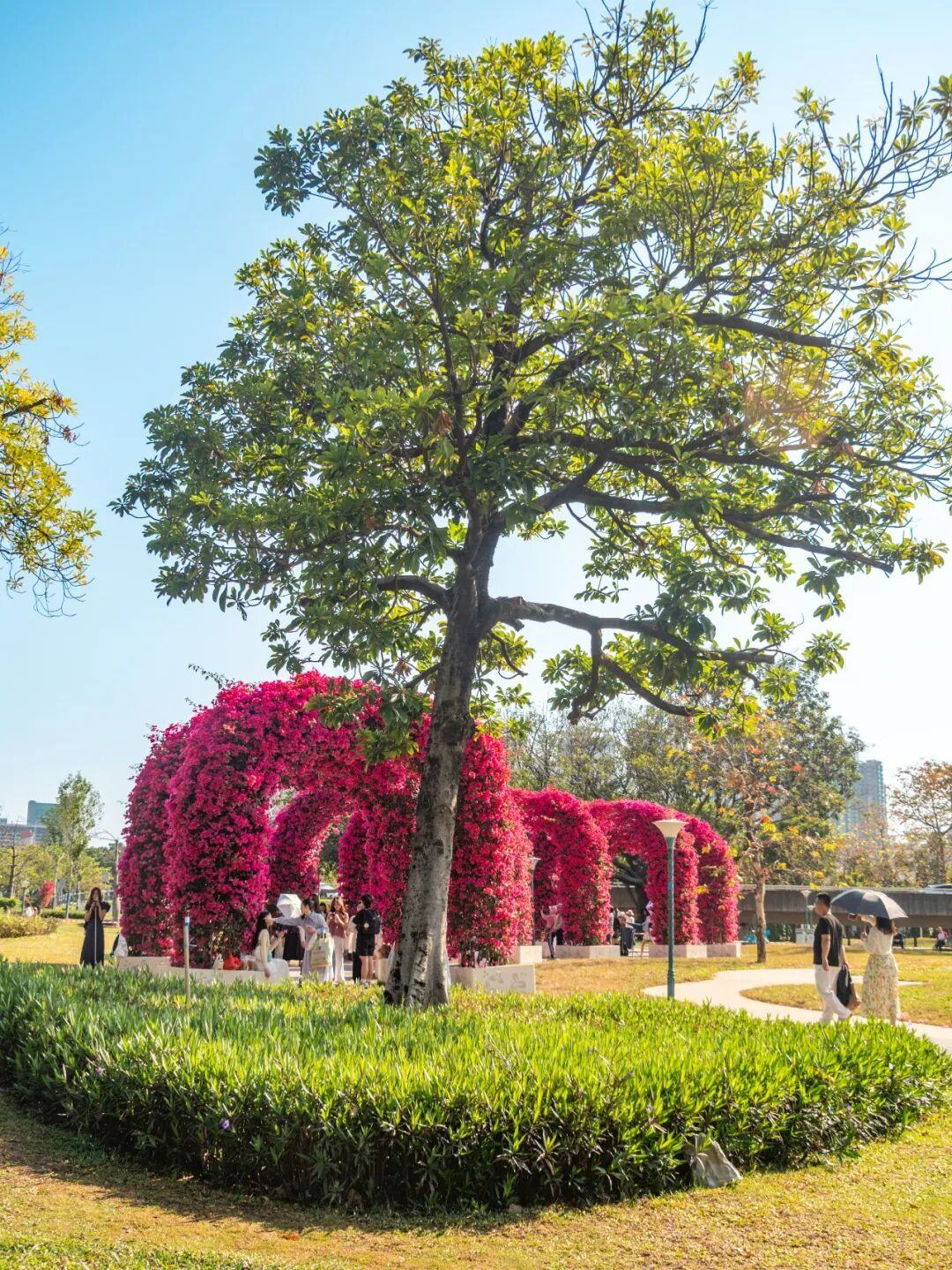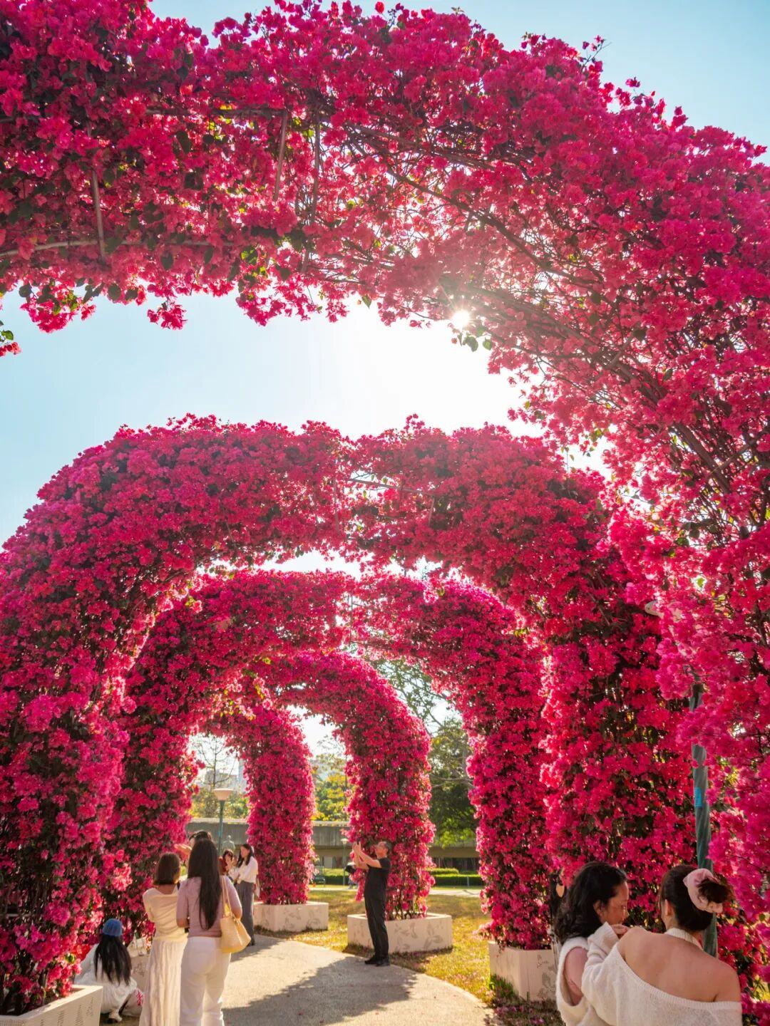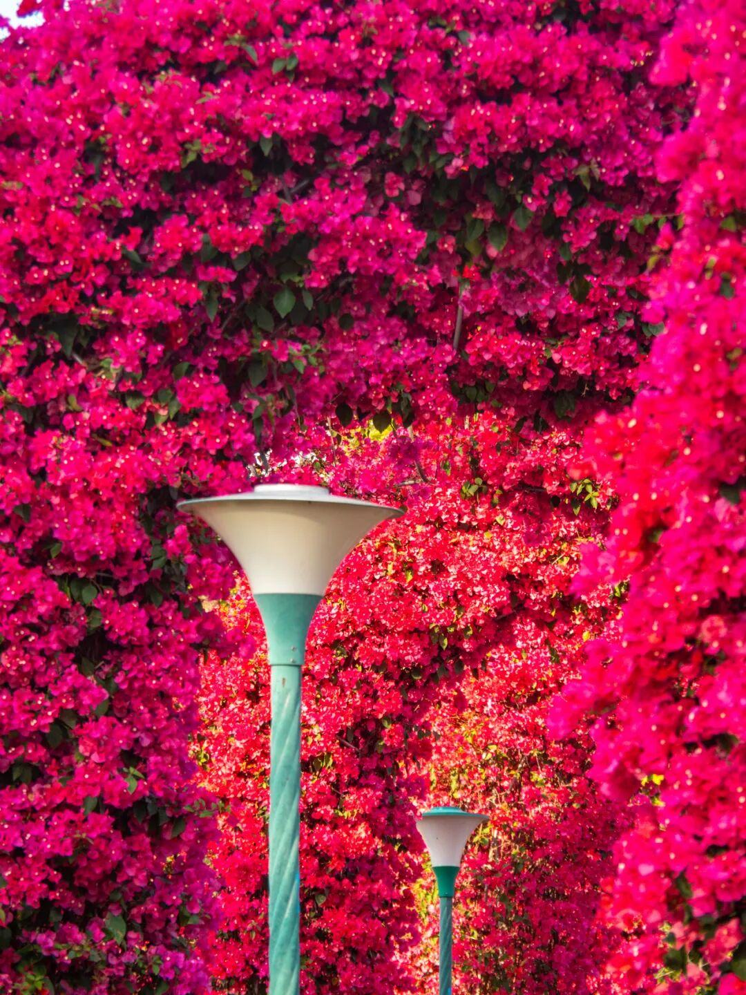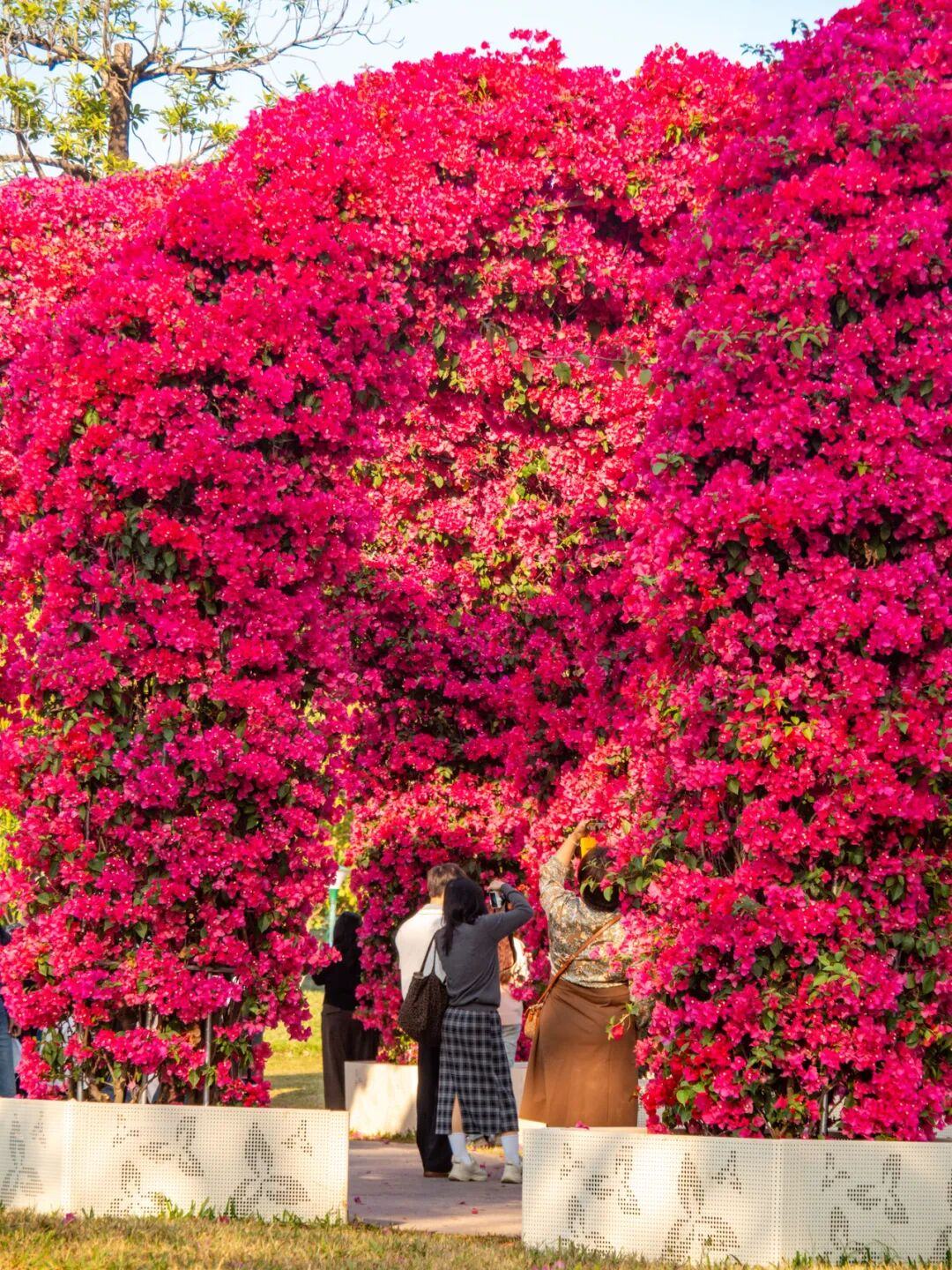 阳光透过簕杜鹃花枝缝隙洒落,在地面投下斑驳光影,游客仿佛穿行在玫红色的童话隧道中。