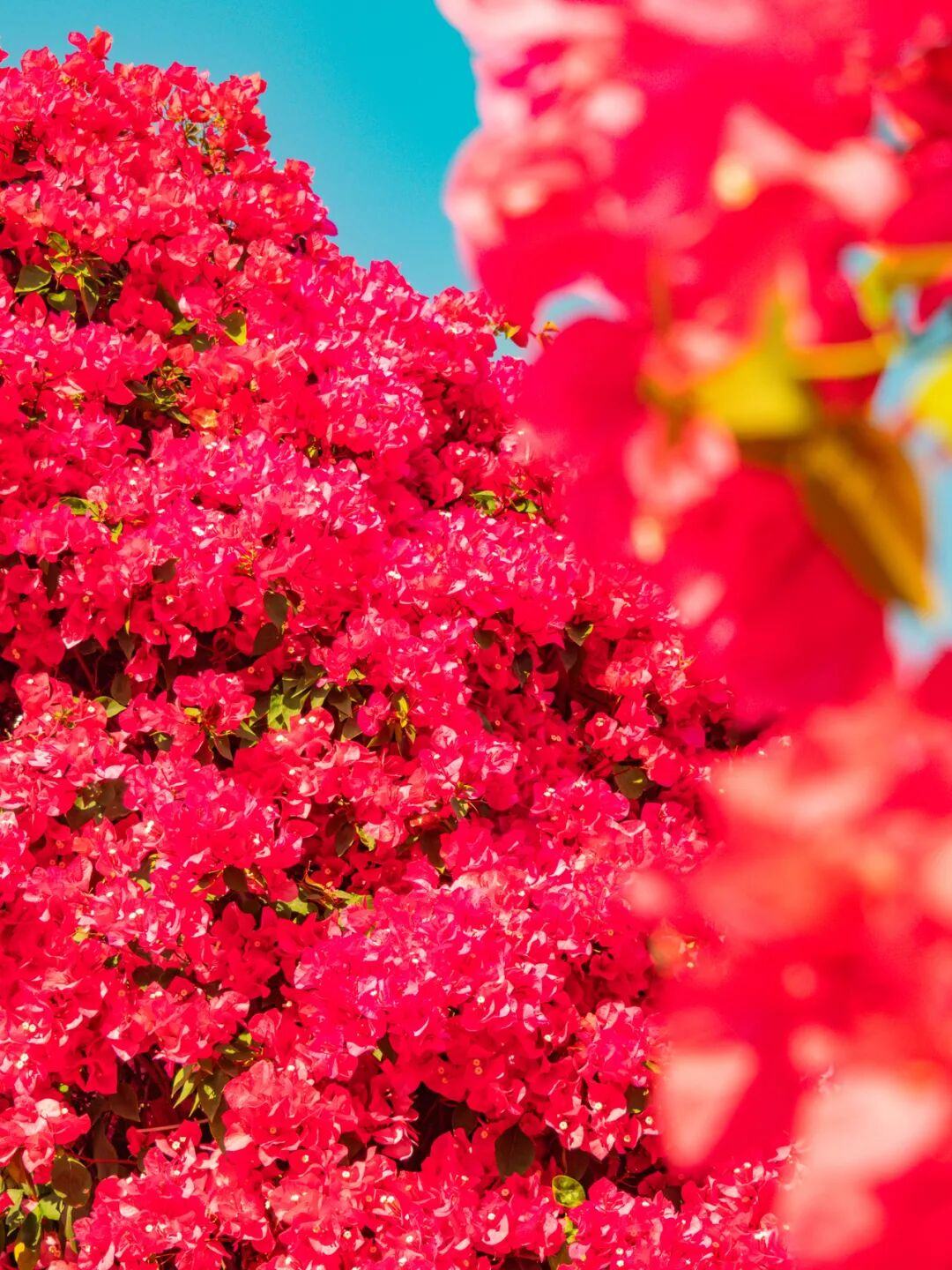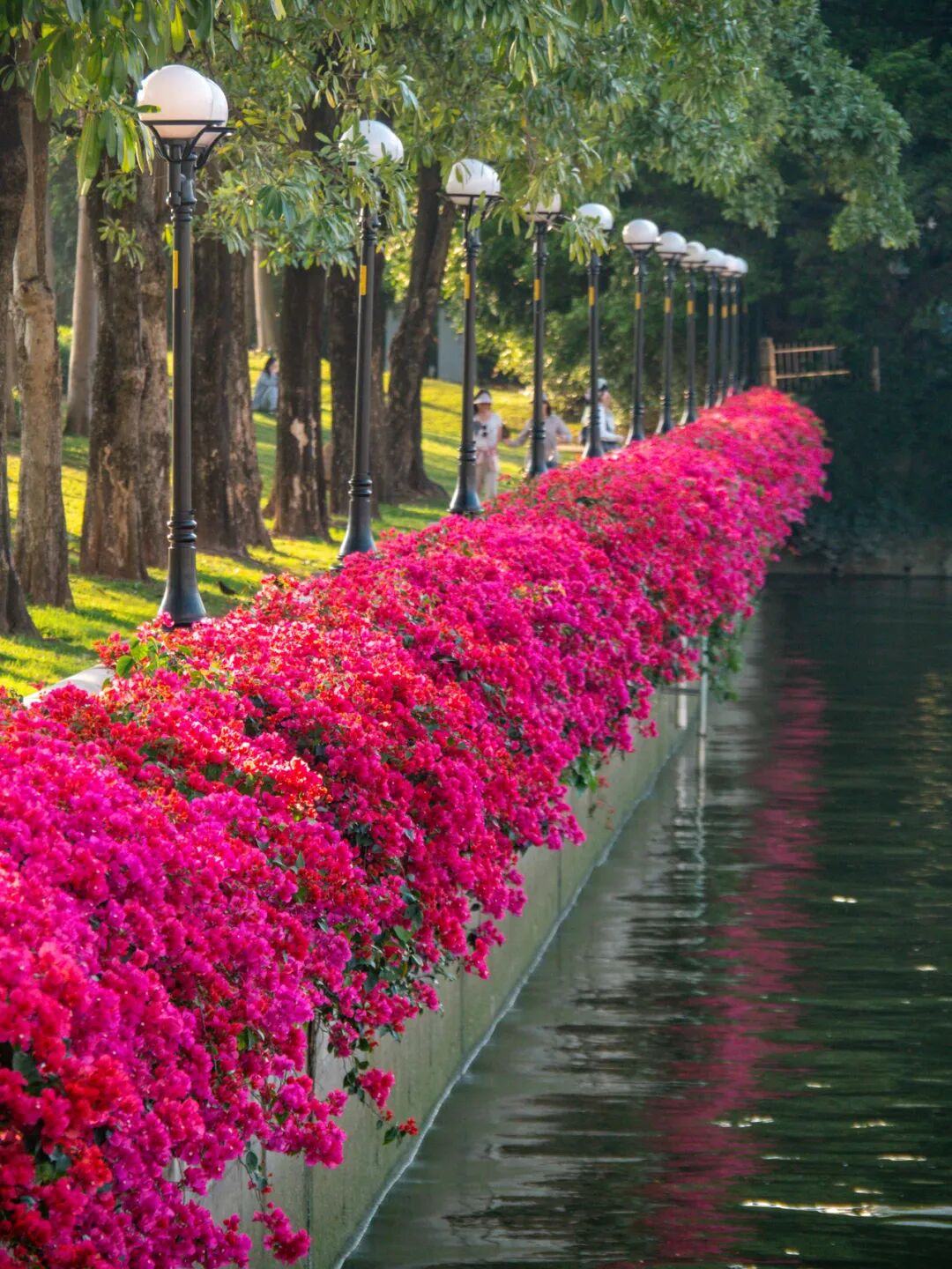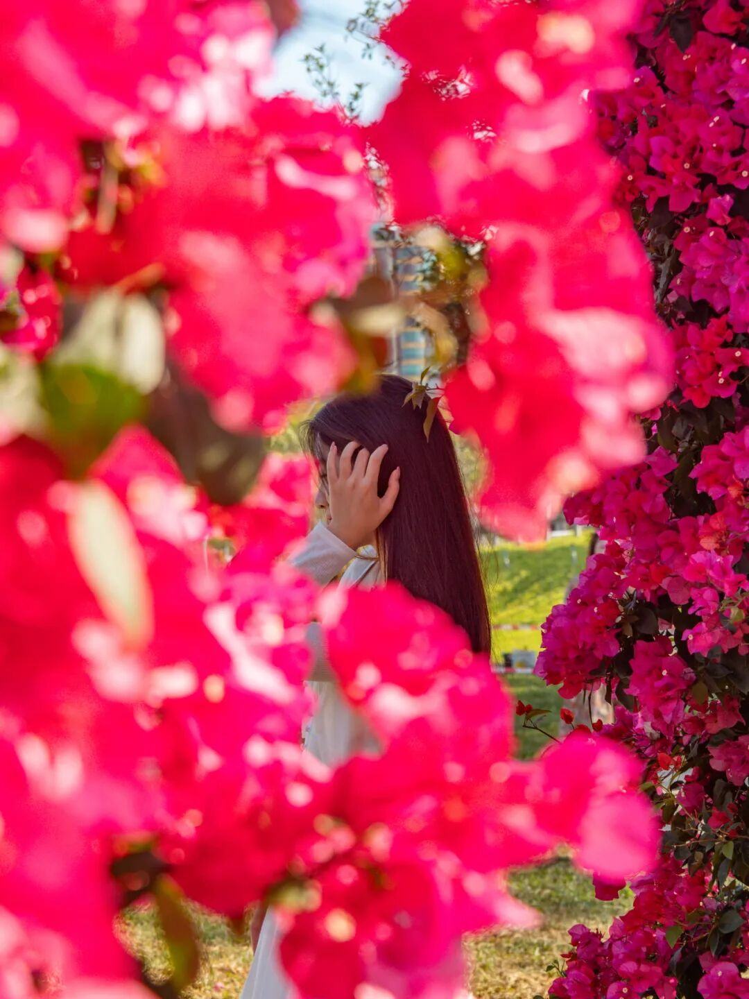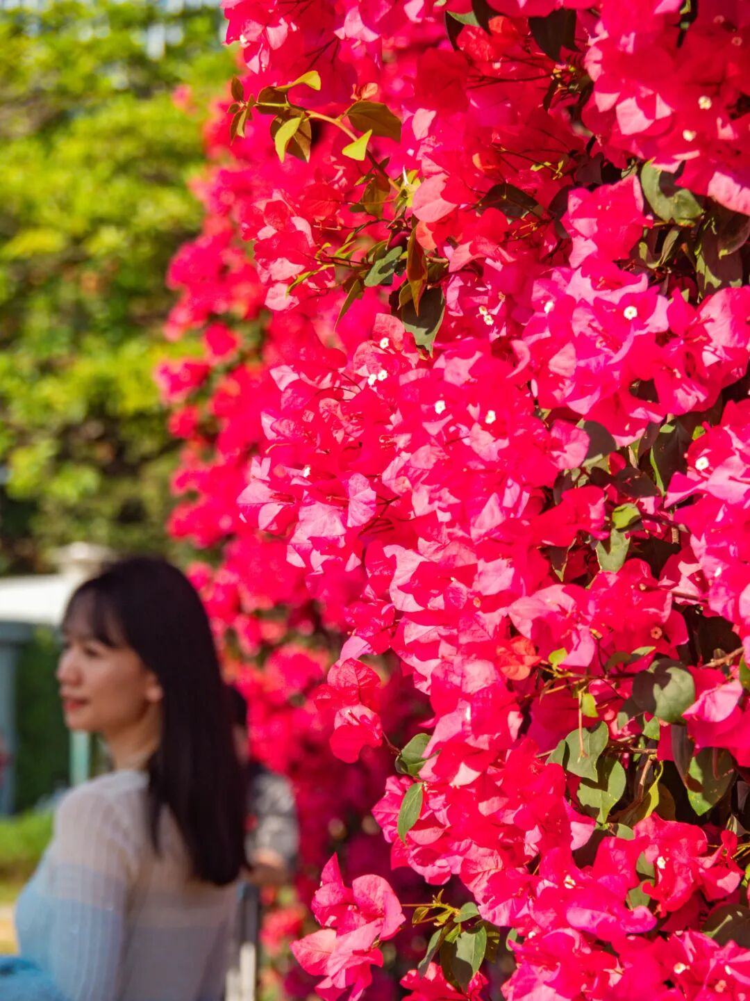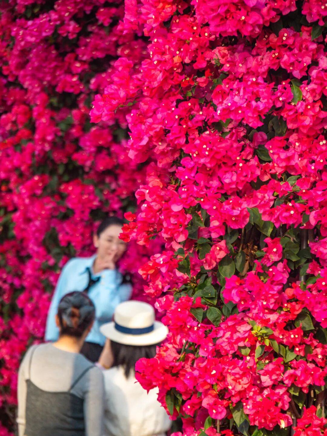 阳光透过簕杜鹃花枝缝隙洒落,在地面投下斑驳光影,游客仿佛穿行在玫红色的童话隧道中。