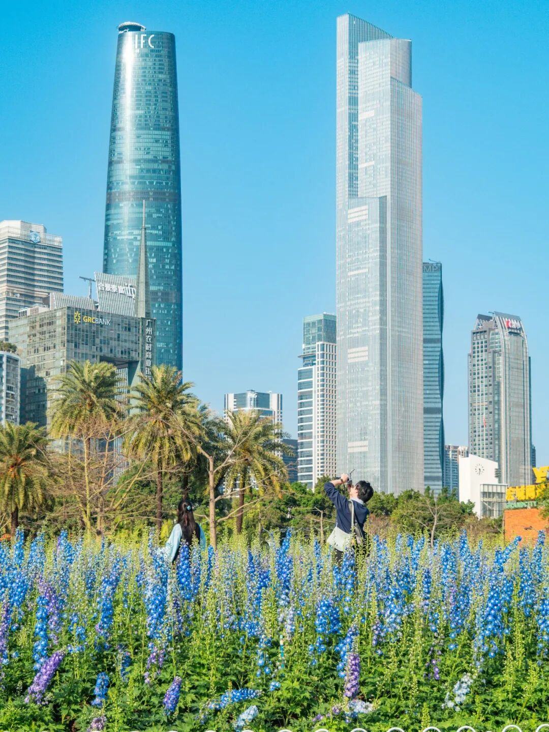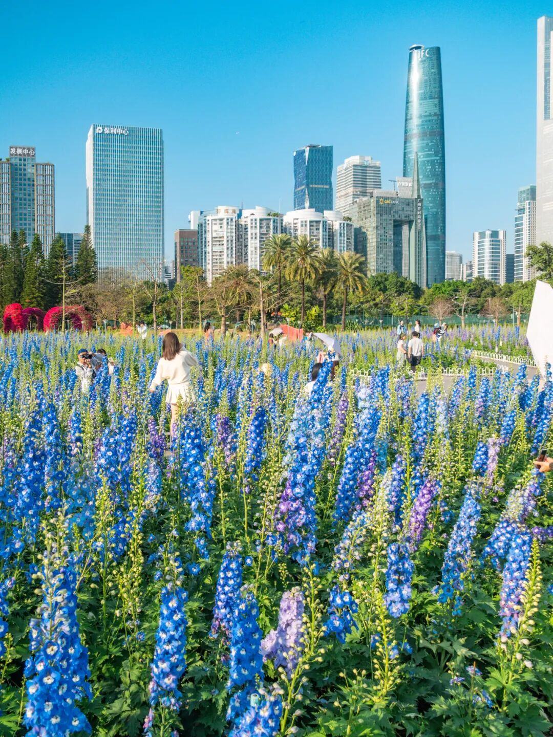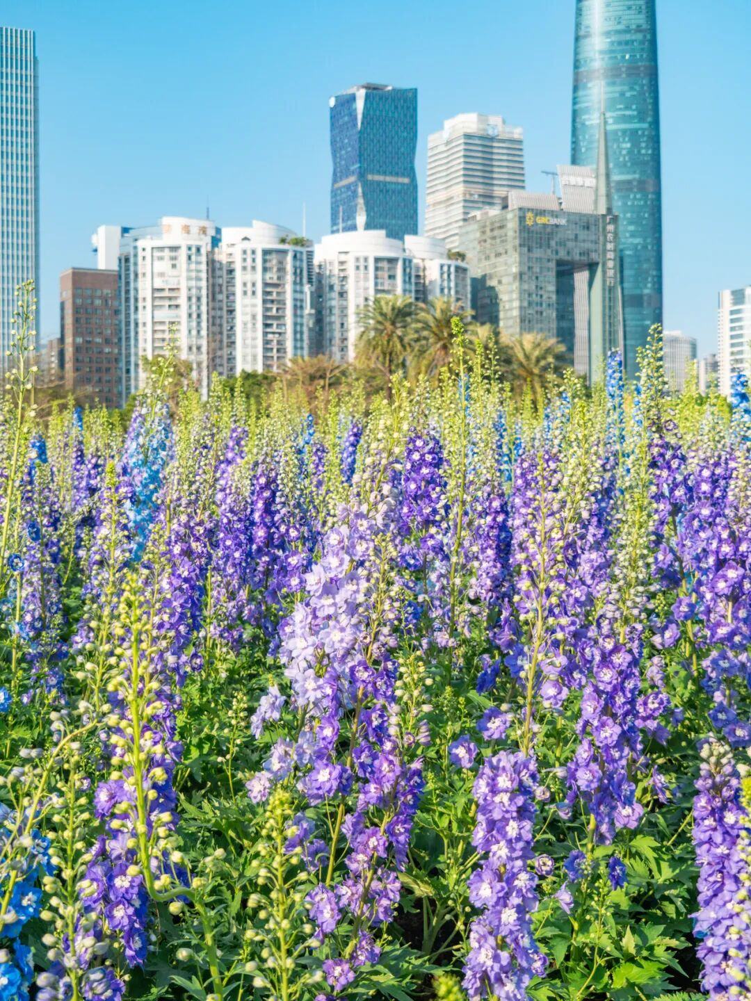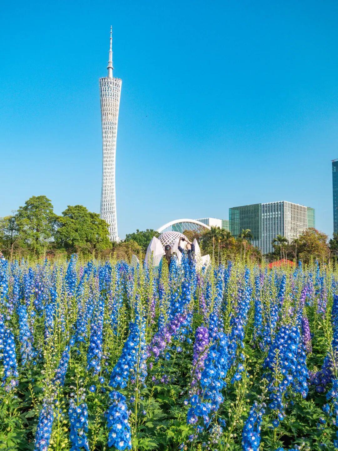 在簕杜鹃拱门下与广州塔同框,在飞燕草花丛间,感受春风拂面。
