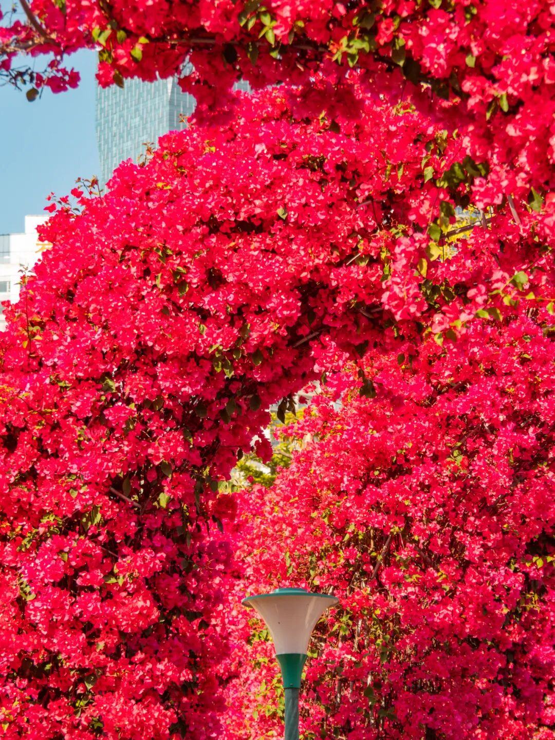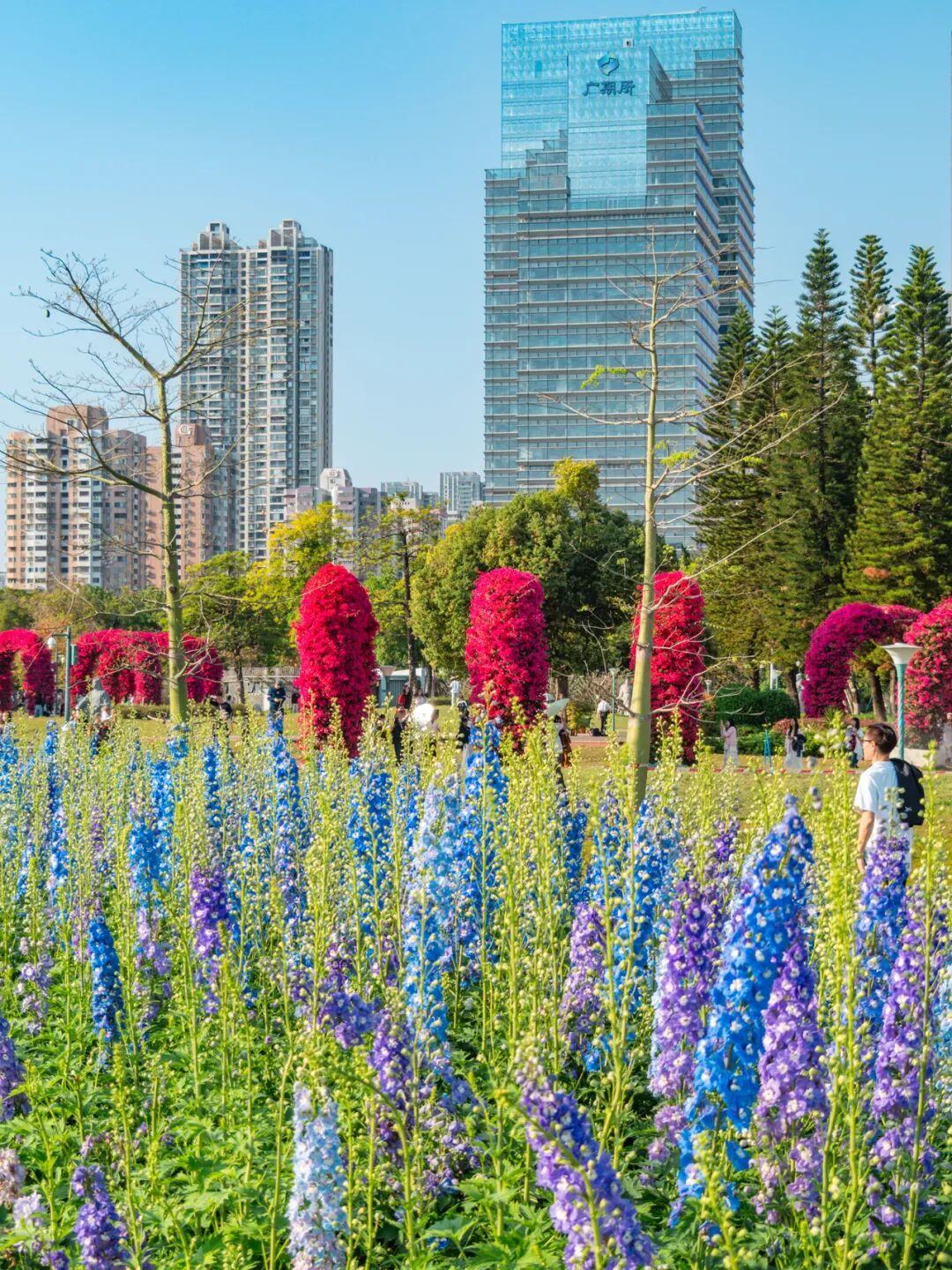 玫红色簕杜鹃开成数十米拱门花廊,蓝紫色飞燕草铺满花园绿地!这个三月,两处绝美花景在广州二沙岛同时“上线”。