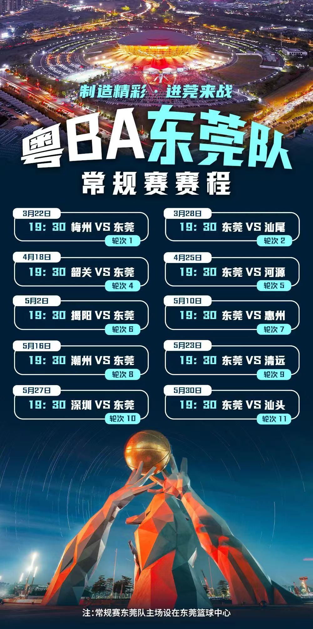 粤BA将于3月21日在广州揭幕,总决赛定于8月1日举行,共有125场比赛,将持续到8月份。3月22日,东莞男篮奔赴梅州开启客场首战。3月28日,东莞队将在市篮球中心迎来首个主场赛事。东莞男篮实行“双主场”布局——第一主场设在可容纳1万人以上的东莞市篮球中心,CBA级别专业赛场,全国一流主场;第二主场设在东莞市体育馆,满足不同赛段需求。小组赛阶段将进行10场主客场单循环对决。