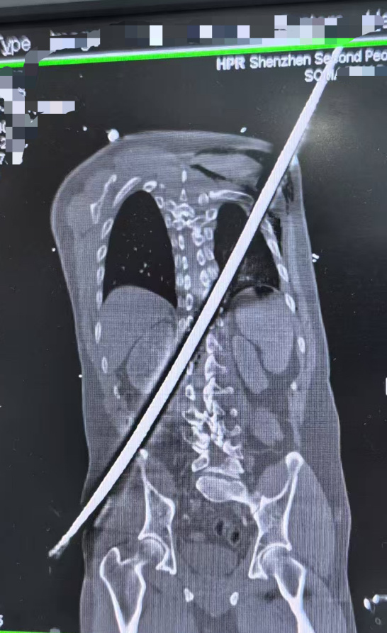 被紧急送到深圳二院时,患者已经陷入休克,生命体征微弱,随时可能离世。CT检查更让医护人员倒吸一口凉气:钢筋紧贴大血管、肾脏,击穿脊柱椎管,患者双下肢无法活动,稍有晃动就可能引发瞬间大出血。
