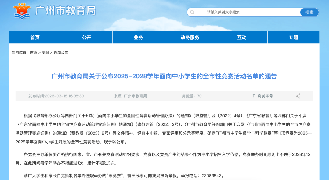 3月18日,广州市教育局官网发布了关于公布2025-2028学年面向中小学生的全市性竞赛活动名单的通告。