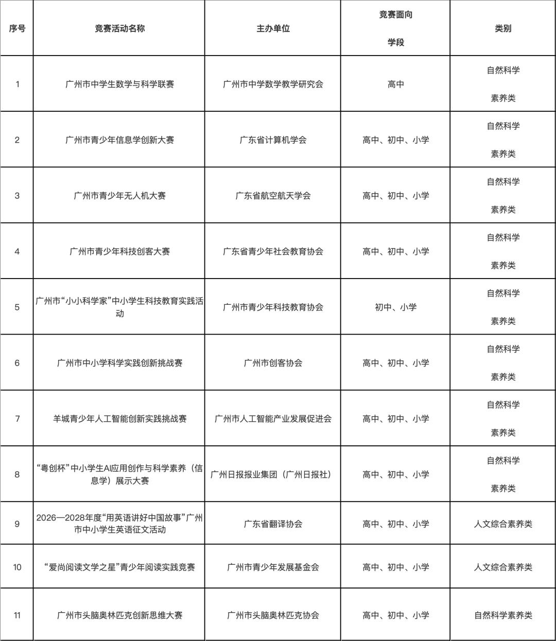 通告显示,2025-2028学年,广州共有11项面向中小学生的“白名单”赛事,包括广州市中学生数学与科学联赛、广州市青少年信息学创新大赛、“粤创杯”中小学生AI应用创作与科学素养(信息学)展示大赛等,涵盖自然科学素养类、人文综合素养类等类别。