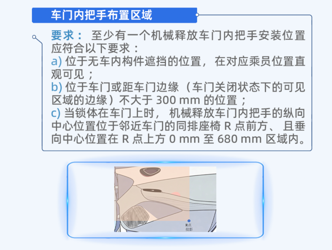 新国标的核心,就是给这道门加一道“备份”,必须配备机械释放结构。而且规定非常细致:应急装置必须在无遮挡的位置、有醒目标识、距离车门把手不能太远。这些细节背后是对人心理和生理状态的考量,事故发生那一刻,人是慌的,行动能力可能受限,本能地会在车门附近寻找出路。