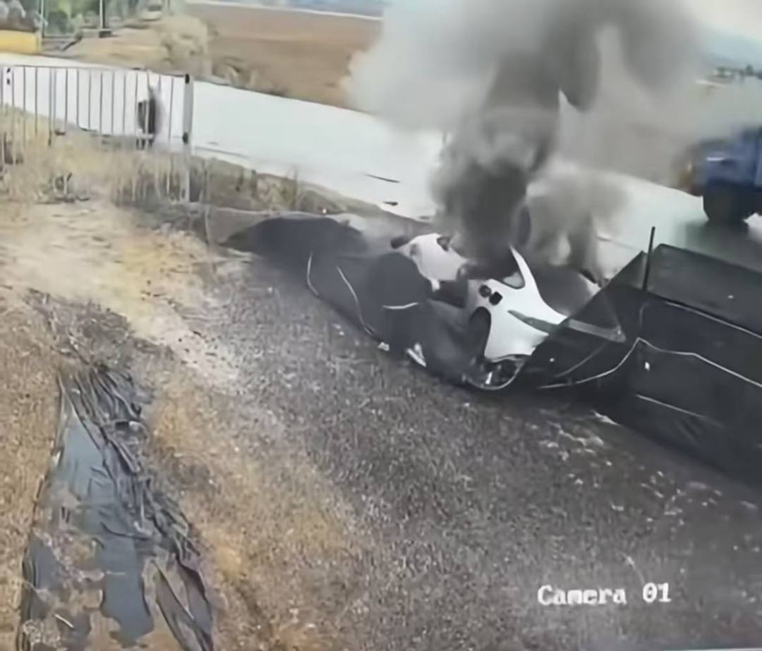 此前引发热议的事故视频截图,事故后该车型隐藏式门把手无法打开