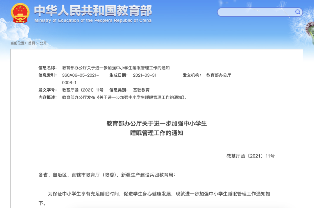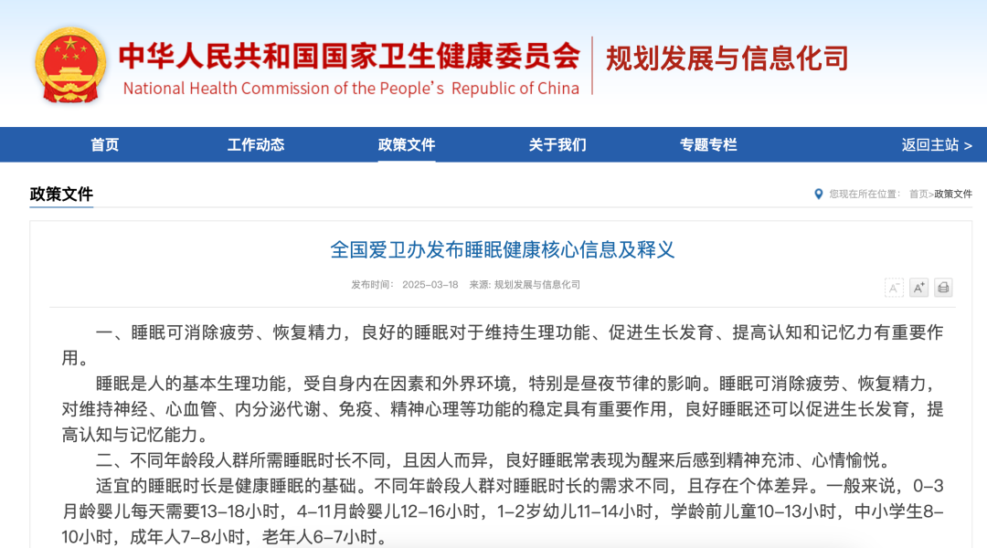 每年的3月21日是“世界睡眠日”。根据教育部办公厅2021年印发的《关于进一步加强中小学生睡眠管理工作的通知》,小学生每天睡眠时间应达到10小时,初中生应达到9小时,高中生应达到8小时。该通知还明确,小学上午上课时间一般不早于8:20,中学一般不早于8:00;学校不得要求学生提前到校参加统一的教育教学活动。
