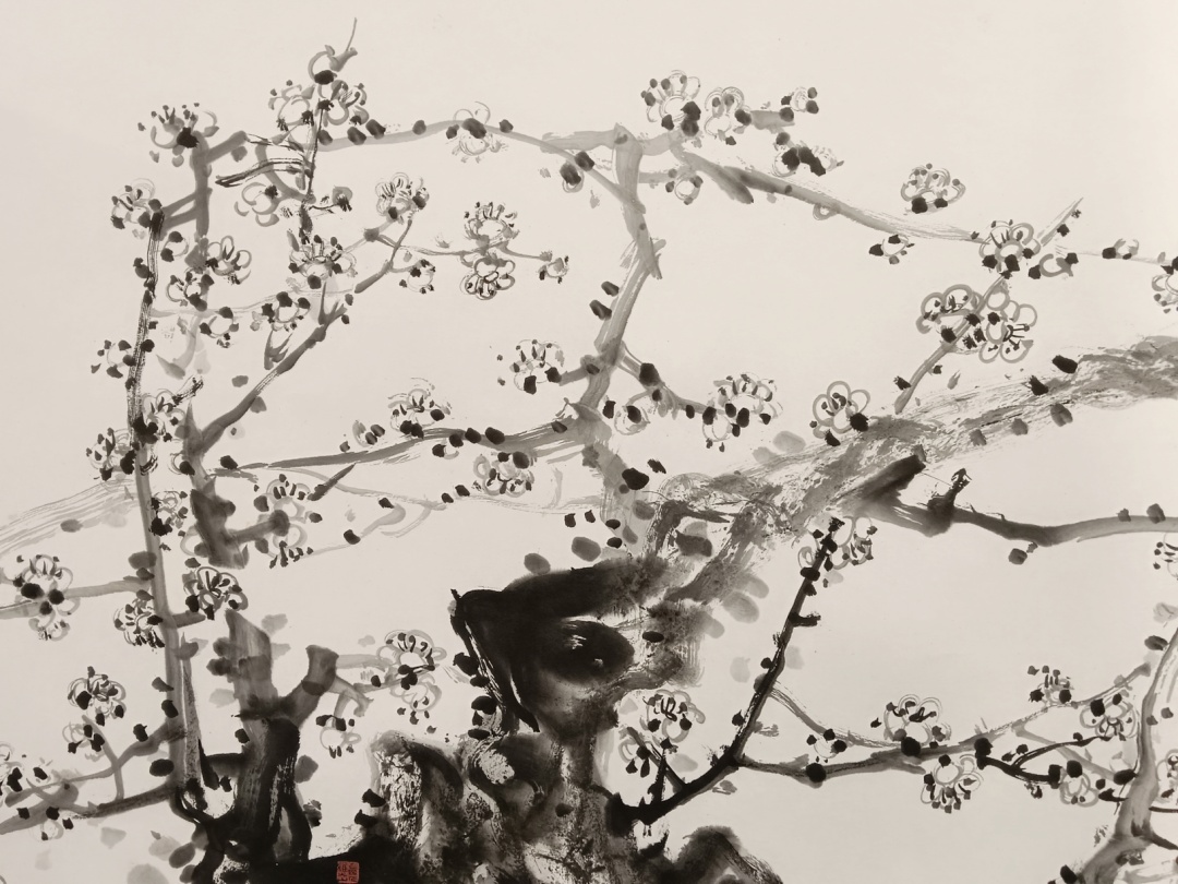 诚然,墨梅的意境表现,自元代王冕始,后经明清及近现代画家发展,已然形成鲜明的写意传统。近现代关山月先生等,将梅画与时代精神完美结合,并赋予其雄浑昂扬的气质,毋庸置疑,陈永锵先生的墨梅清晰体现出这一脉络下的笔墨意趣!