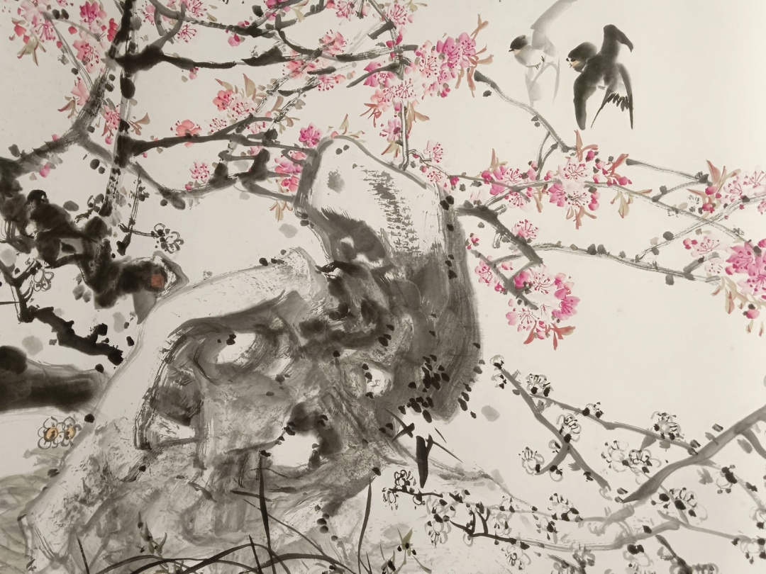 以“桃花、春燕、湖石、兰草”为核心元素所构成的画面,生动描绘了春日生机盎然的景象。陈永锵先生以没骨法点染桃花花瓣,粉白与胭脂晕染层次分明,花瓣娇柔鲜活;枝干以浓墨枯笔写出,苍劲挺拔,与柔美的花朵形成刚柔对比,尽显“桃之夭夭”的意趣之美!燕子则以简笔勾勒,墨色浓淡表现羽翼层次,姿态灵动翻飞,或振翅欲飞,或回首顾盼,为画面注入动感与活力,湖石部分则是以焦墨皴擦、淡墨晕染,表现出嶙峋多孔的质感,作为画面的视觉重心,既稳定了构图,又与柔美的花木形成强烈对比,体现出“石令人古”的审美意趣。画面下方以细劲的墨线勾勒兰叶,飘逸舒展,与湖石的厚重形成呼应,暗合“兰石清坚”的高洁品格。此构图采用斜向穿插式布局,桃枝自左上向右下延伸,湖石居于画面中下部,燕子点缀于枝头与空中,疏密错落,动静结合,营造出“疏影横斜、燕舞春风”的美妙意境!